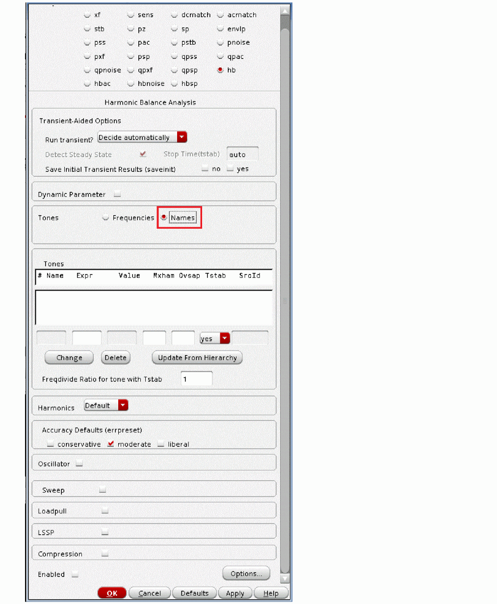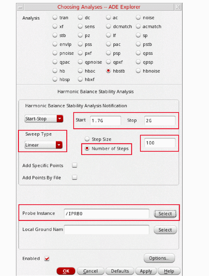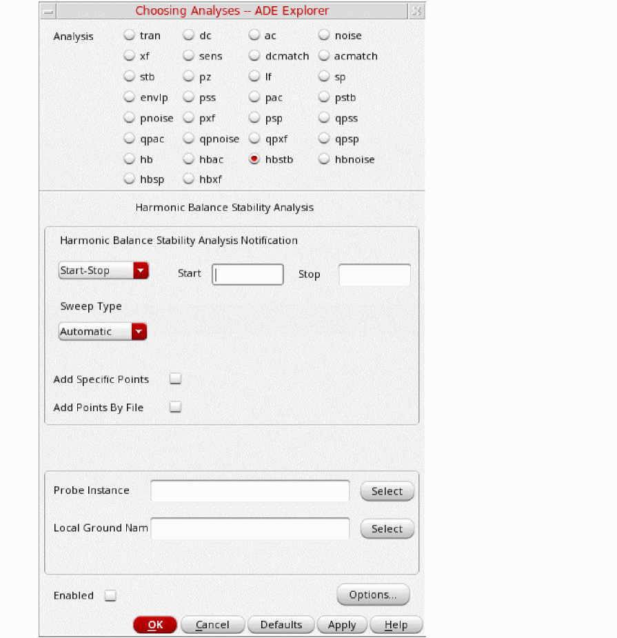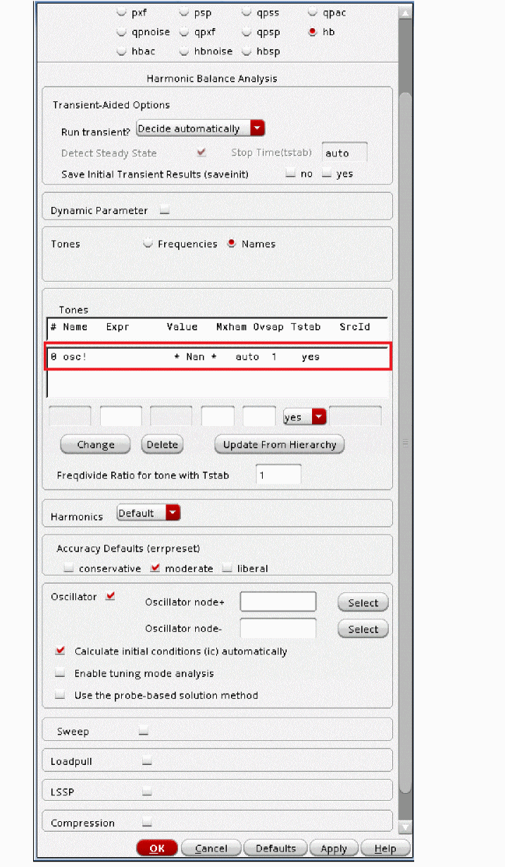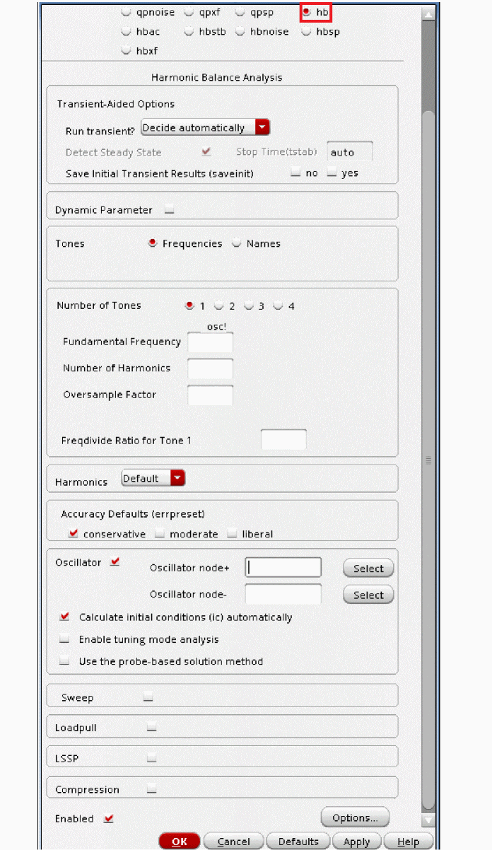 Regardless of which technique you use to start the oscillator, allow the oscillator to run long enough to stabilize before you start the HB or Shooting phase and compute the steady state solution. Adjust the tstab parameter to supply the additional stabilization period. High Q oscillators often need a longer tstab. For extremely high Q circuits, you may need to set tstab to about 50K to 200K periods of oscillation with the default method. However, when setting Calculate initial conditions (ic) automatically option you may reduce it to just 10 periods.