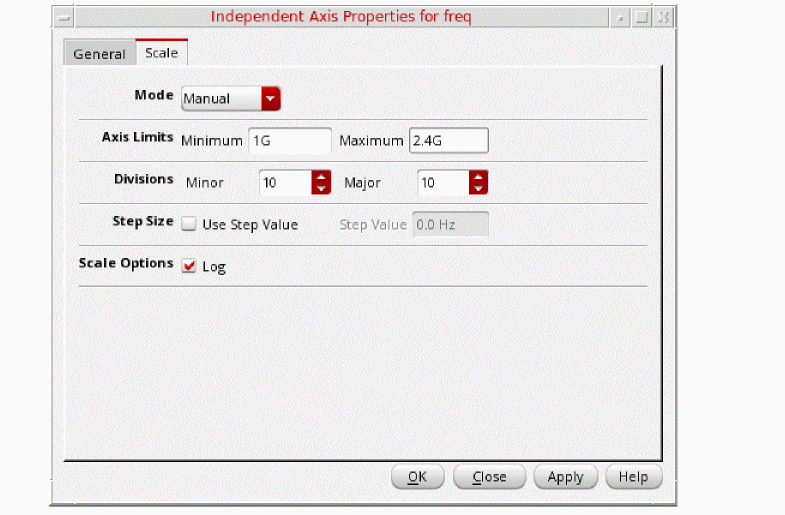 Fill in the Start Frequency (Hz) and Stop Frequency (Hz) fields. These are the limits of integration to determine jitter. The appropriate values are included either in the jitter specifications or in the verification methodology. The best values to use also depend on the circuit properties. For a small Number of Cycles [k], such as a short observation time of one or a few periods, the lower frequency noise does not contribute much to either Jc or Jcc jitter. For a larger Number of Cycles [k], the lower frequency noise is important.