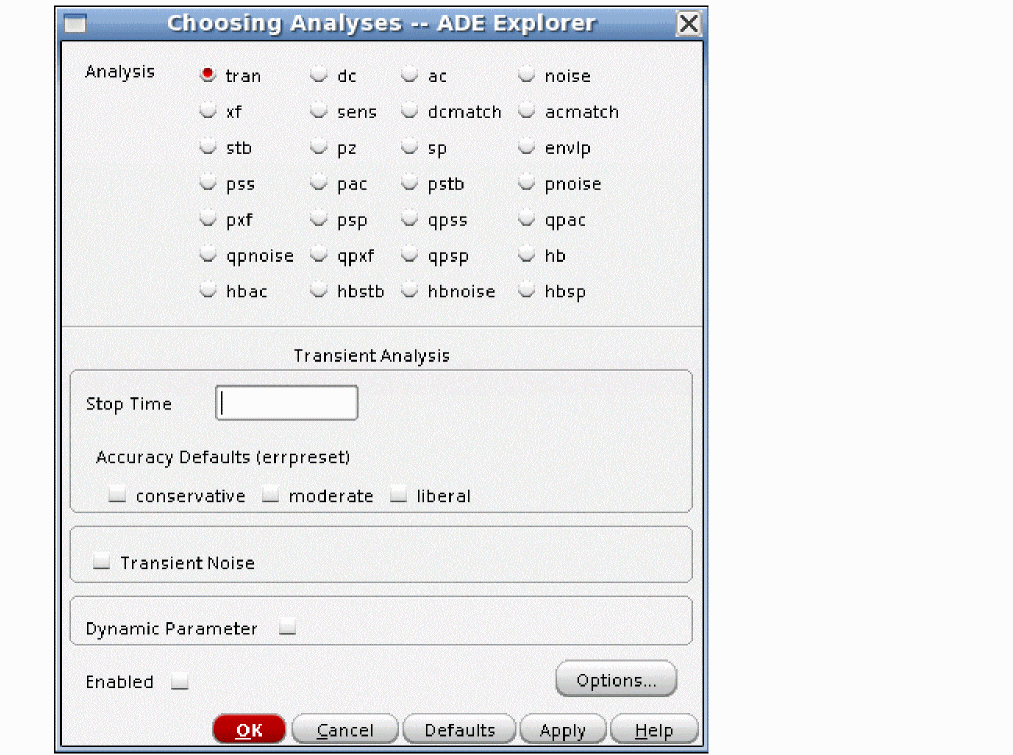 The Choosing Analysis form is provided for each analysis type you want to run. The Choosing Analysis form lists the sources in your circuit at the top. The number of harmonics and oversample factor are set in the edit fields just below the list. Accuracy is set by selecting liberal, moderate, or conservative. In general, to get a quick idea, choose liberal. For most simulations, choose moderate. When a more accurate simulation is desired, select conservative. If you have an oscillator, select the oscillator button. Sweeps can be set up in the form directly, or by using the parametric plot tool in ADE.