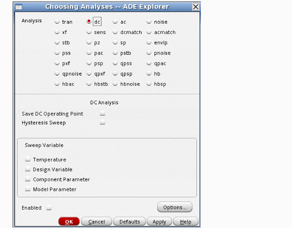 In the Choosing Analyses form, select the dc option from the Analysis section.