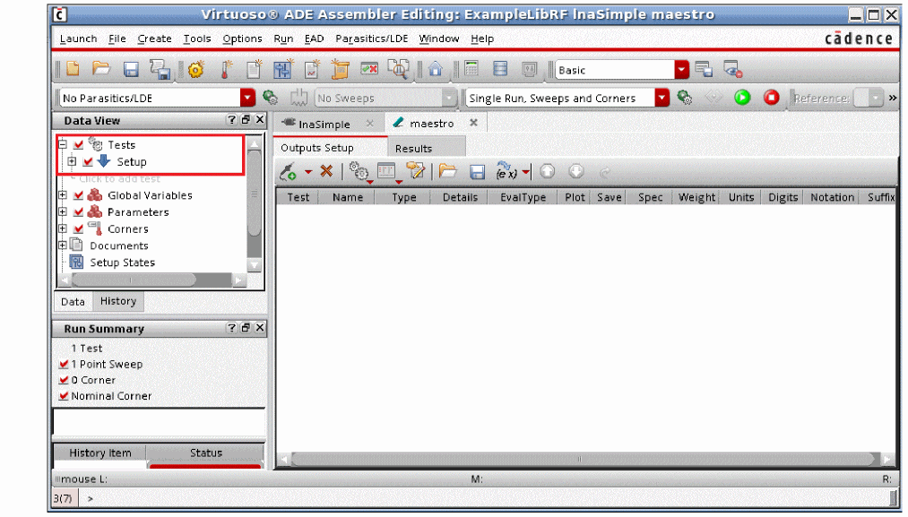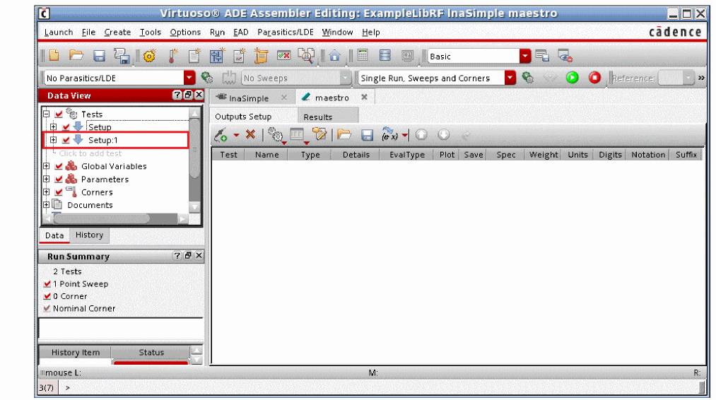 After the simulation run is complete, click the blue up arrow button located to the left of Setup, under the Setup pane, The ADE Assembler window is displayed with Setup displayed under Tests in the Data View assistant, as shown below.