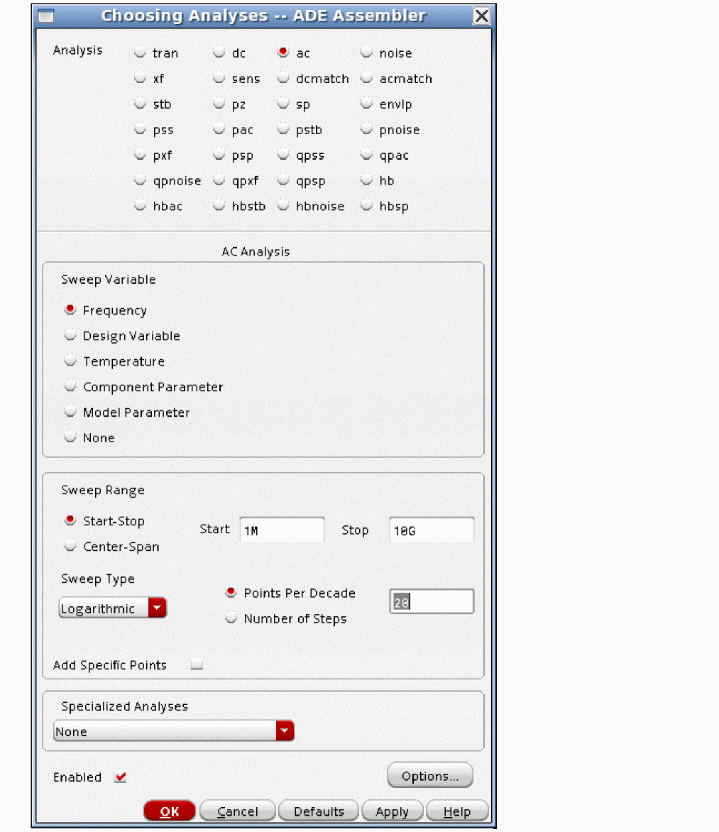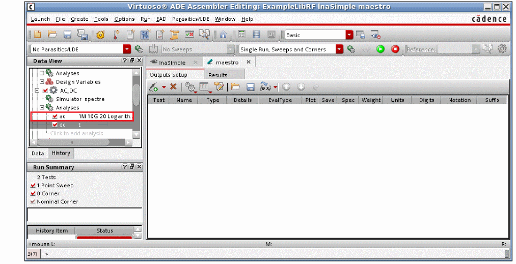 Note that ac analysis is added in the test, as shown below.