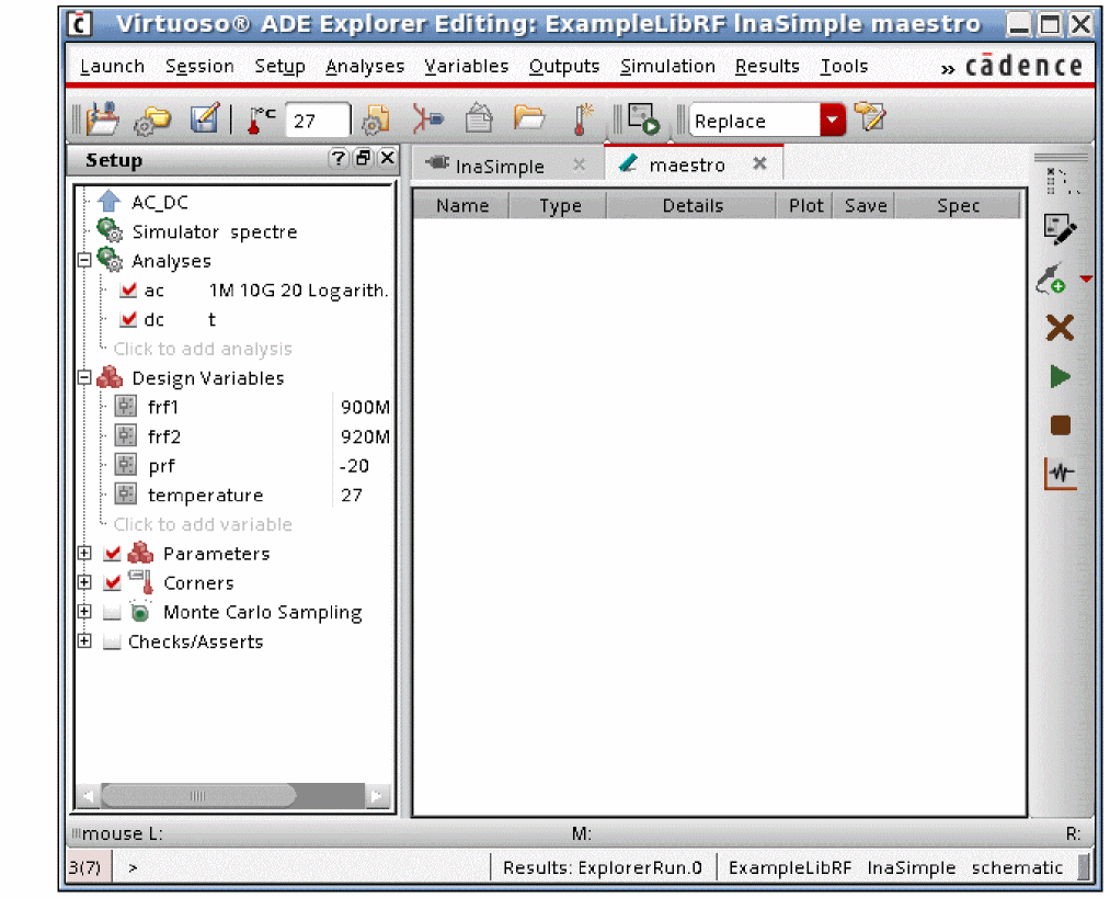 You need to specify the following essential settings in the Virtuoso® ADE Explorer Setup before running a simulation — design variables, temperature, simulator, analysis, model files, and other setup files. You can also define the various outputs that are to be saved or plotted during a simulation run.