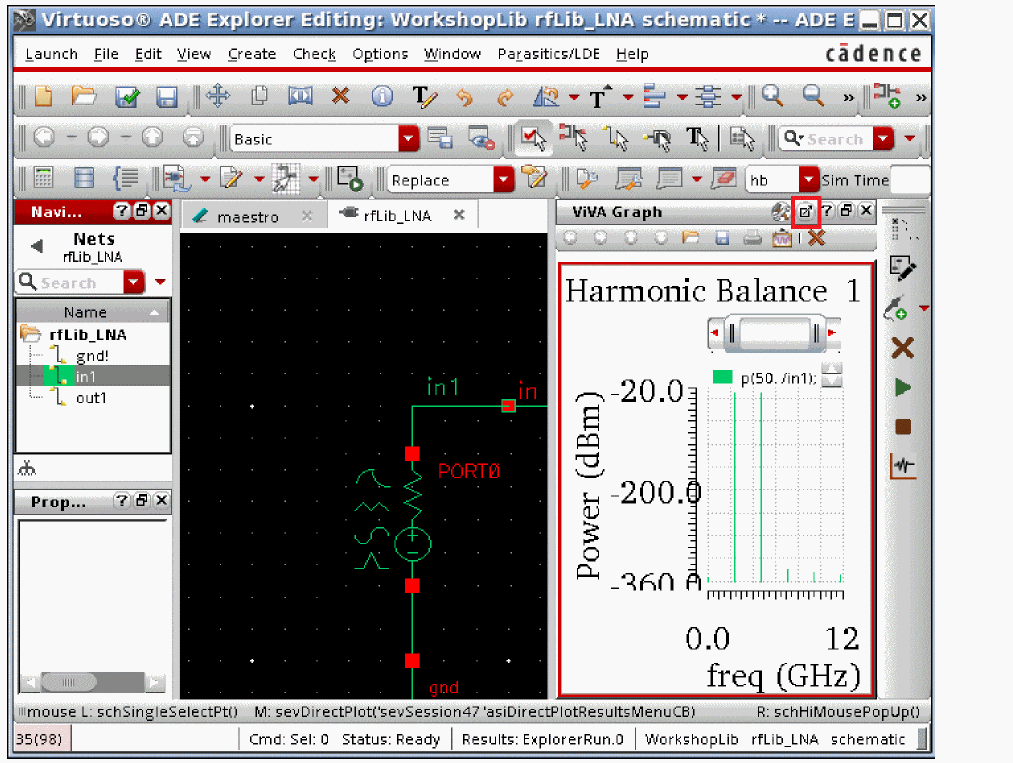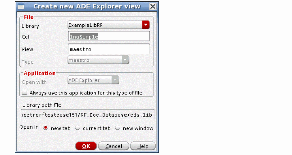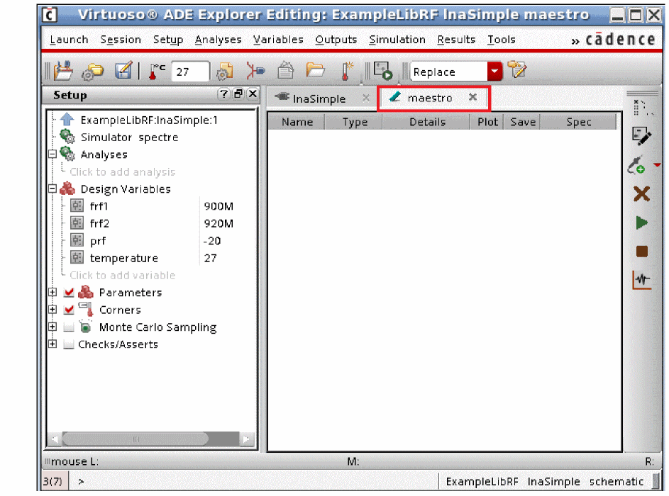 ADE Explorer, incorporates some useful features of ADE XL while maintaining the simplicity and ease of use of ADE L. ADE Explorer is like ADE L in that it can run a single design and simulation setup at a time. It adds the ability to run parallel simulations in sweeps. Corners and Monte Carlo are also available along with real-time tuning (RTT) which is useful for rapidly tuning filters or matching networks. ADE Explorer also allows very easy transitions to ADE Assembler, which allows multiple tests and is similar to ADE XL. Like ADE XL, the simulation environment is in one tab, and the schematic is in another in ADE Explorer, as shown highlighted in the figure below.