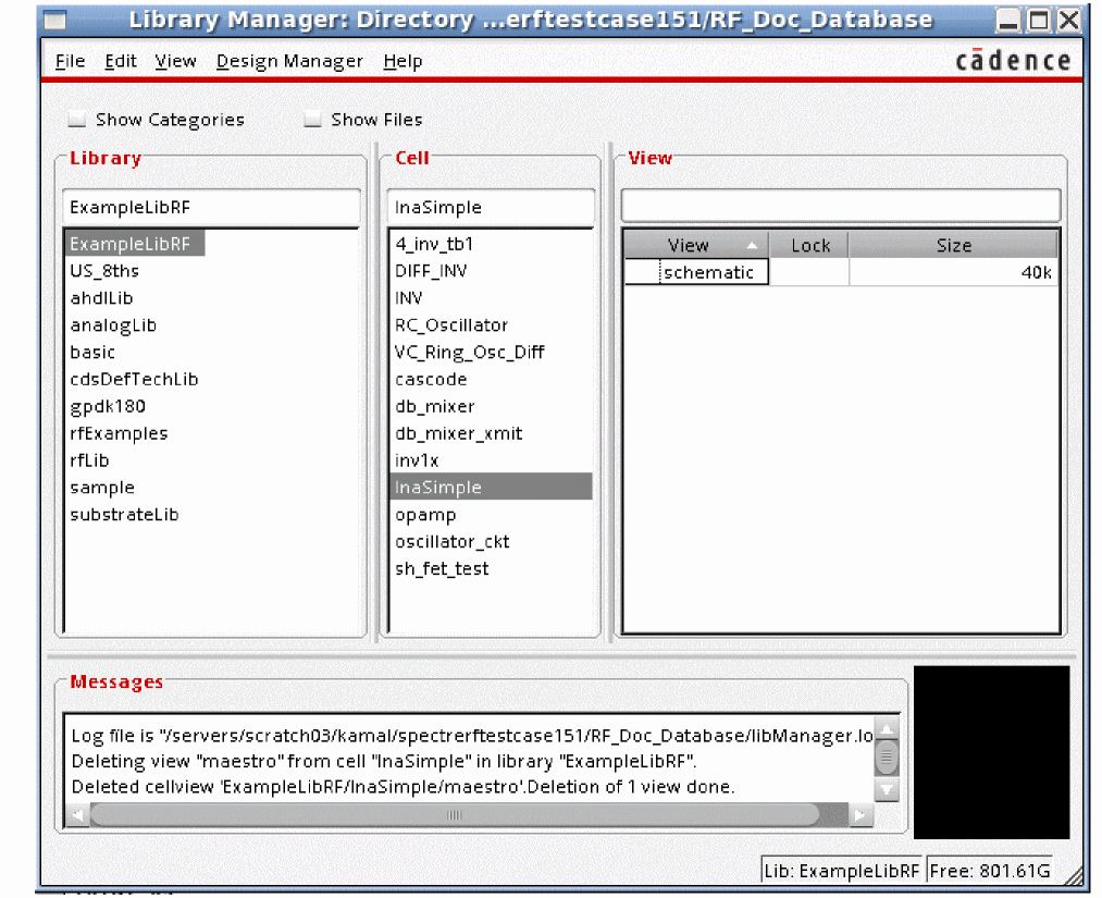 Open a design in ADE Explorer. To do this, launch virtuoso and select Tools - Library Manager from the Virtuoso window. The Library Manager window is displayed, as shown below.