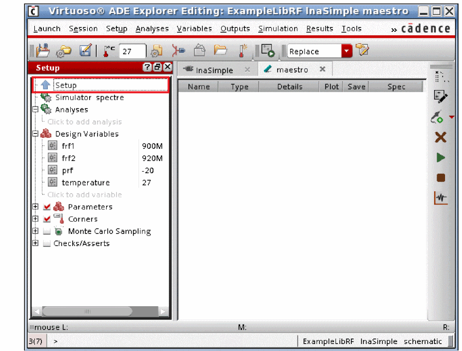 - Click on the test ExampleLibRF:lnaSimple:1 twice and change the name to Setup.