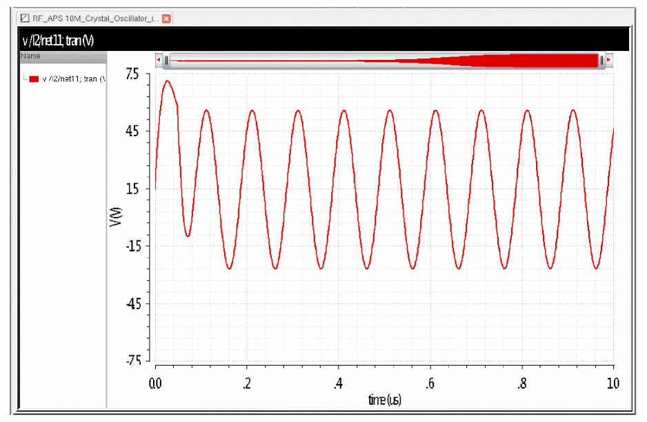 Set the One value to a current that starts the oscillator, but does not drive it too hard at the start. You will need to experiment with this value using the transient. In the waveform window below, the junction of the inductor and capacitor in the crystal motional equivalent circuit is plotted. This voltage will get quite large because of the high Q. Change the One value so that one to ten volts peak is generated at this node at the start of the transient simulation, and no huge transients are generated.