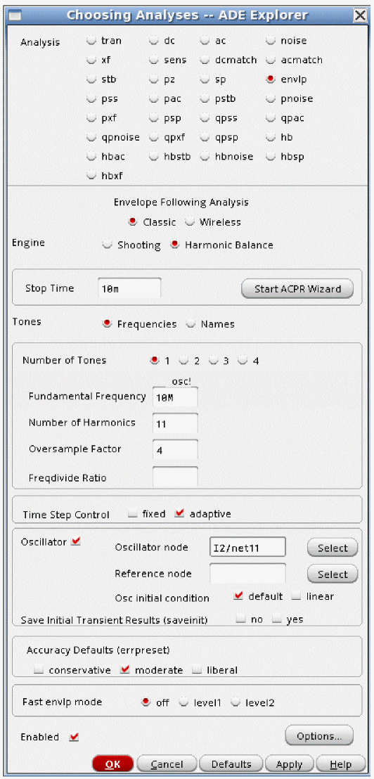 The only additional requirement in the Choosing Analyses form for oscillators is the requirement to select the check box for oscillators, and specify a node or pair of nodes that has the oscillator signal on it. If the osc initial condition check box is set to linear, the nodes must be in the resonator of the oscillator. Although not a requirement, it is recommended that you use adaptive timestep control, and set the modulationbw (modulation bandwidth) option to the frequency of the oscillator divided by the Q of the oscillator.
