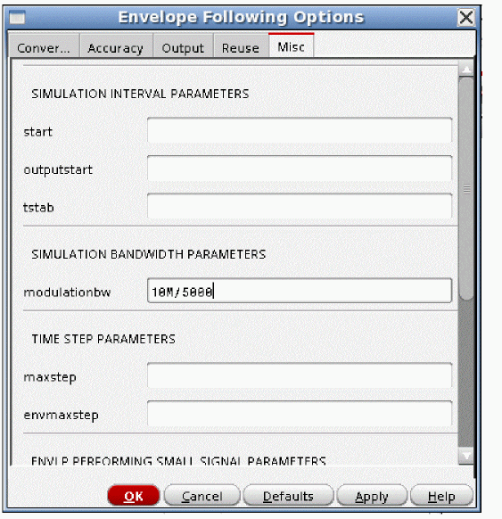 modulationbw and envmaxstep accomplish the same thing, which is to define a maximum time interval to skip between carrier cycles that are simulated. When modulationbw is set, at least eight periods of the carrier are simulated in the time period of one cycle of the frequency modulationbw. modulationbw does not force data at equally spaced intervals, like envstrobeperiod does. Instead, it sets a a maximum delta-time for skipping cycles. There is no default.