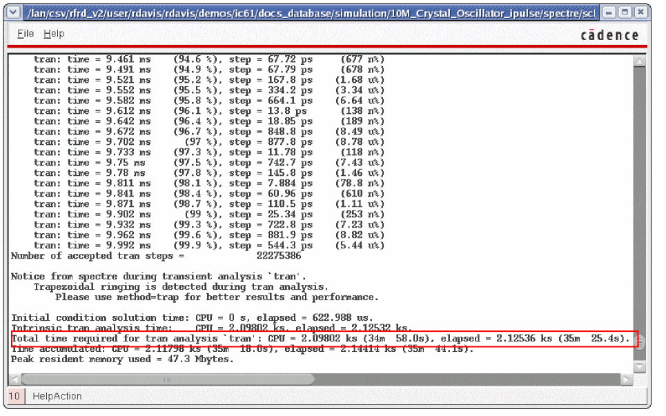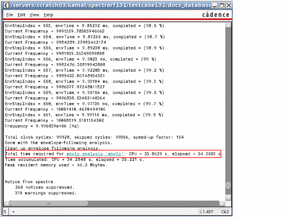 Now run the simulation. Below is a comparison of the runtimes for the envelope analysis and for the transient analysis. Note that the runtime is much shorter for the envelope analysis.