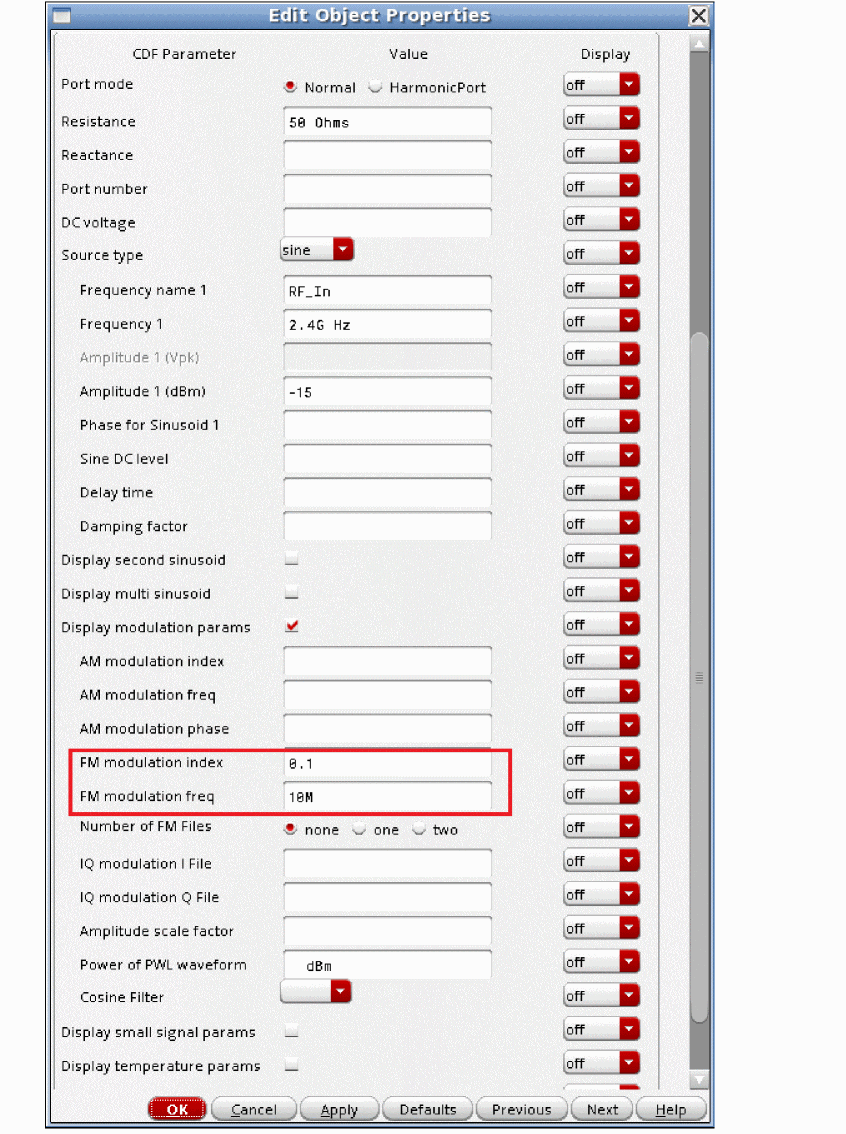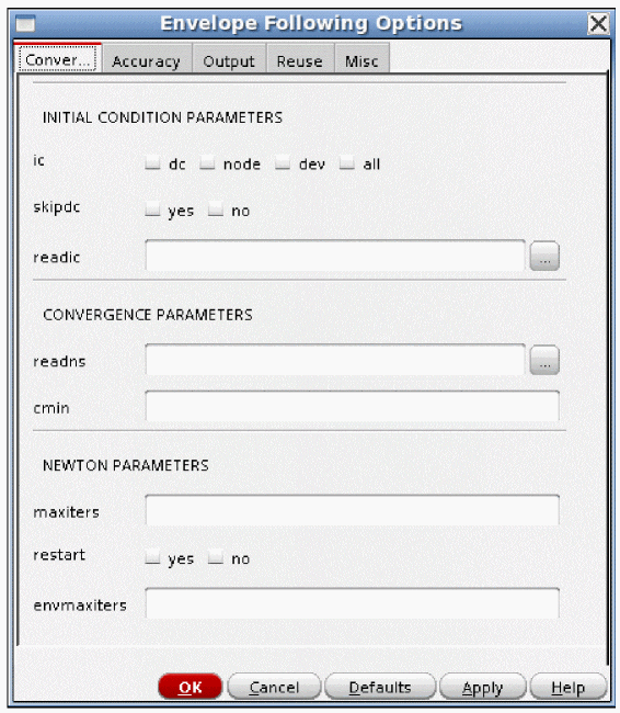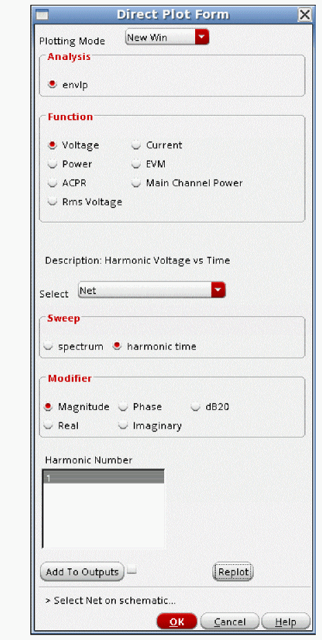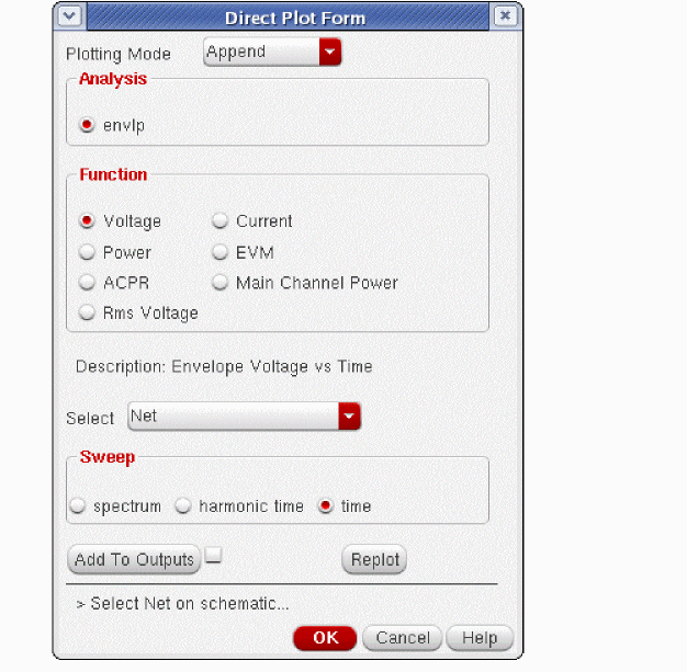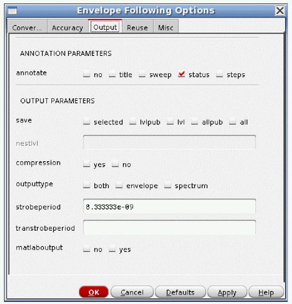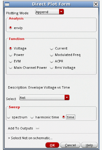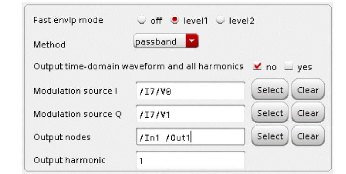 This option is rarely used. It controls which simulation results to save. Normally, both time and frequency domain data is saved. Envelope saves the time-domain data only. Spectrum saves just the frequency-domain data. The default is to save both time and frequency-domain data. Note that in fast envelope, you need to select the yes check box to the right of Output time-domain waveform and all harmonics in order to calculate time-domain output.