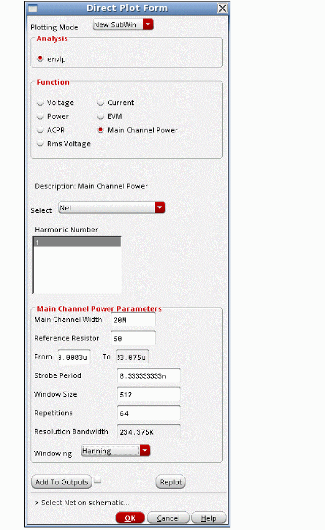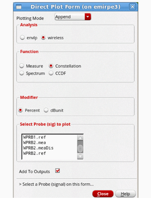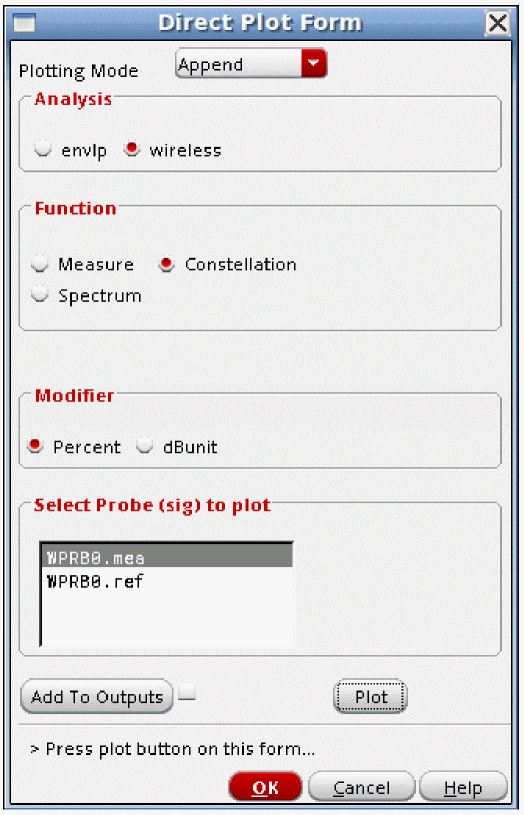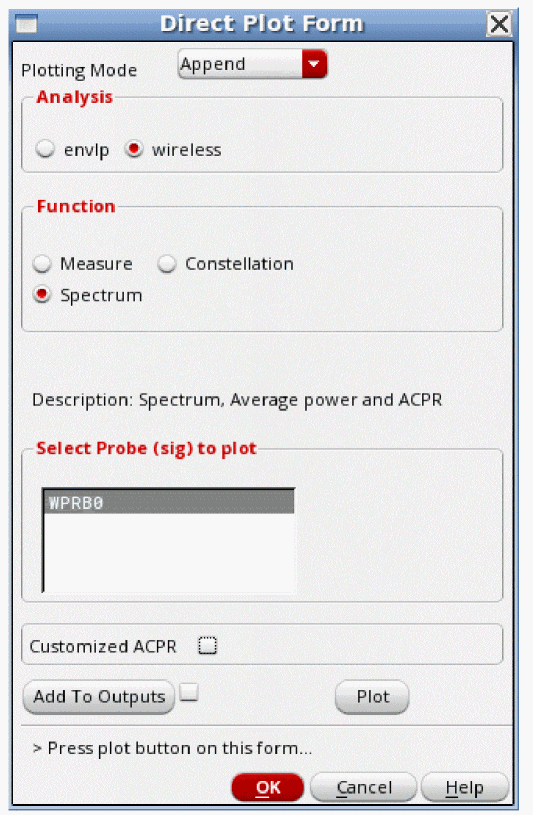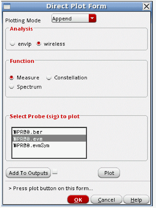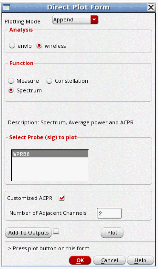 Now open the Direct Plot Form. All the common measurements are available from the Direct Plot Form. For all wireless plots, select the wireless analysis choice at the top of the form. To plot the spectrum, select Spectrum, and then select the probe you want to plot.