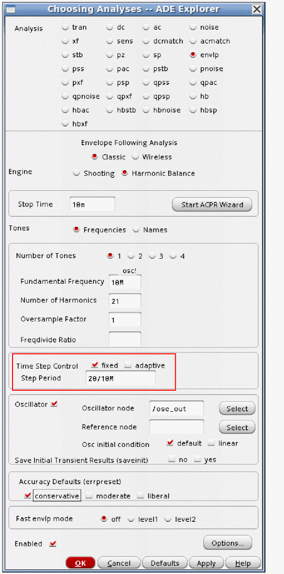 - Select adaptive Time Step Control. This allows the simulator to place the periods of oscillator simulation at the appropriate place.