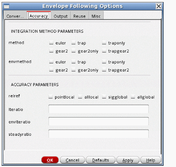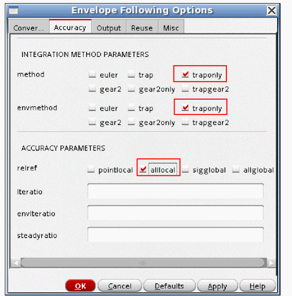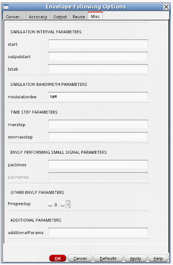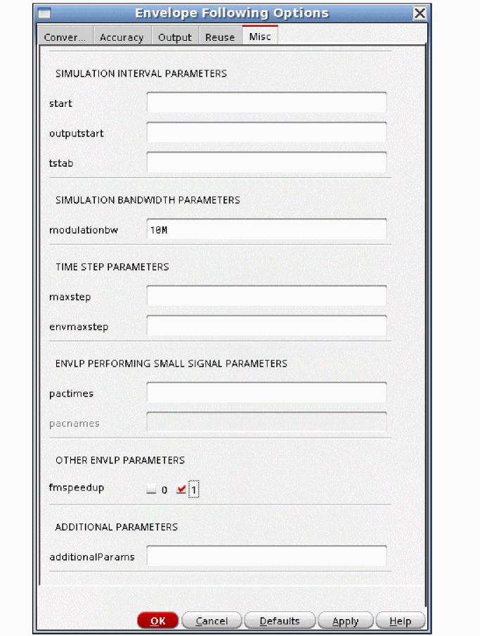 During the transistor-level envelope simulation, one or more of the carrier periods that are simulated can be used as the nonlinear operating point for the small-signal pac, pxf, pnoise, or psp analyses. pactimes is a list of times separated by a space for the large-signal envelope solution that should be used for the small-signal analyses. The default is to not use any points for the small-signal analyses.