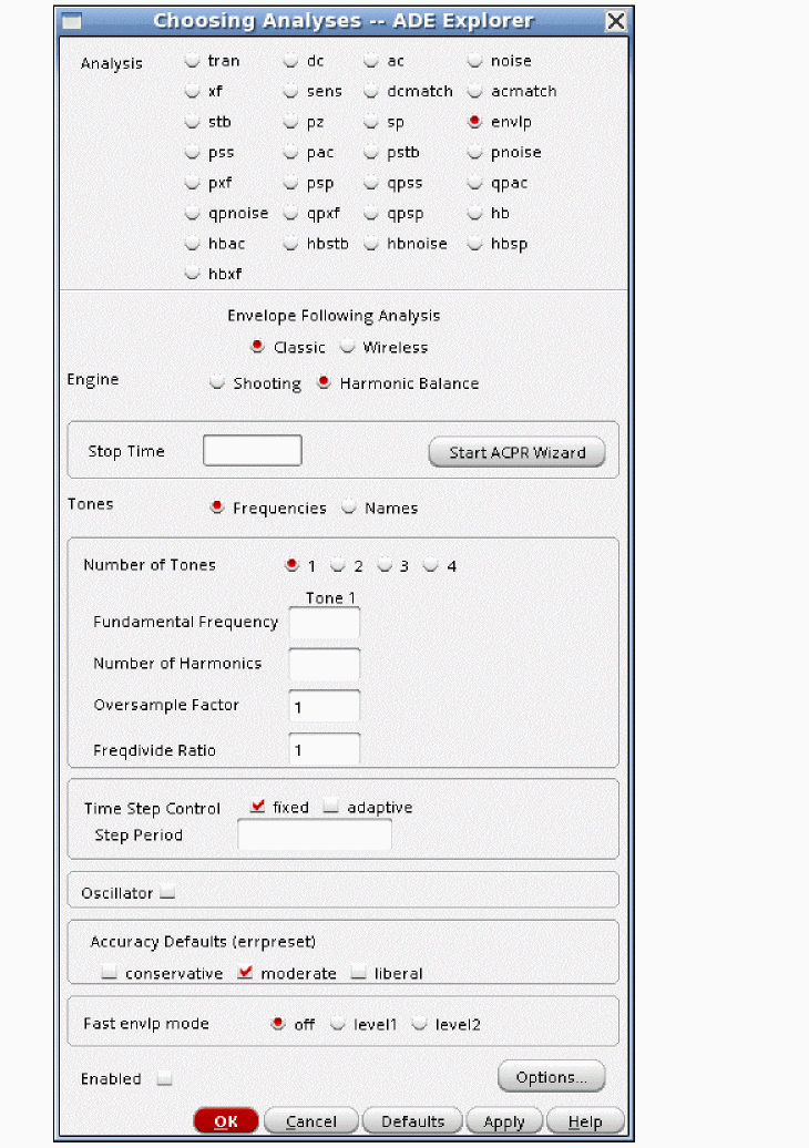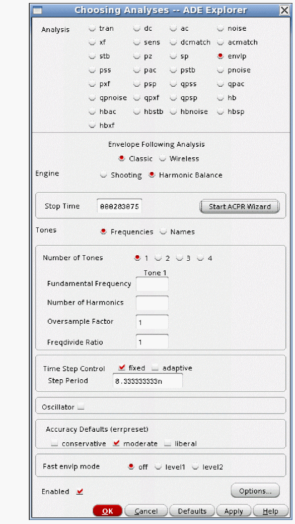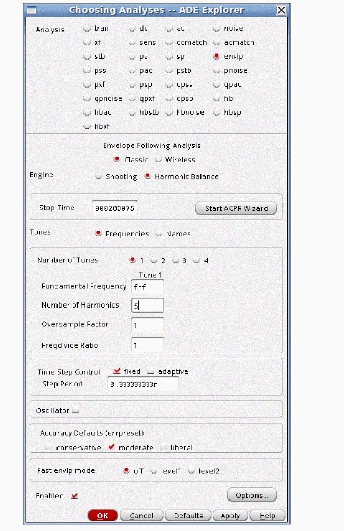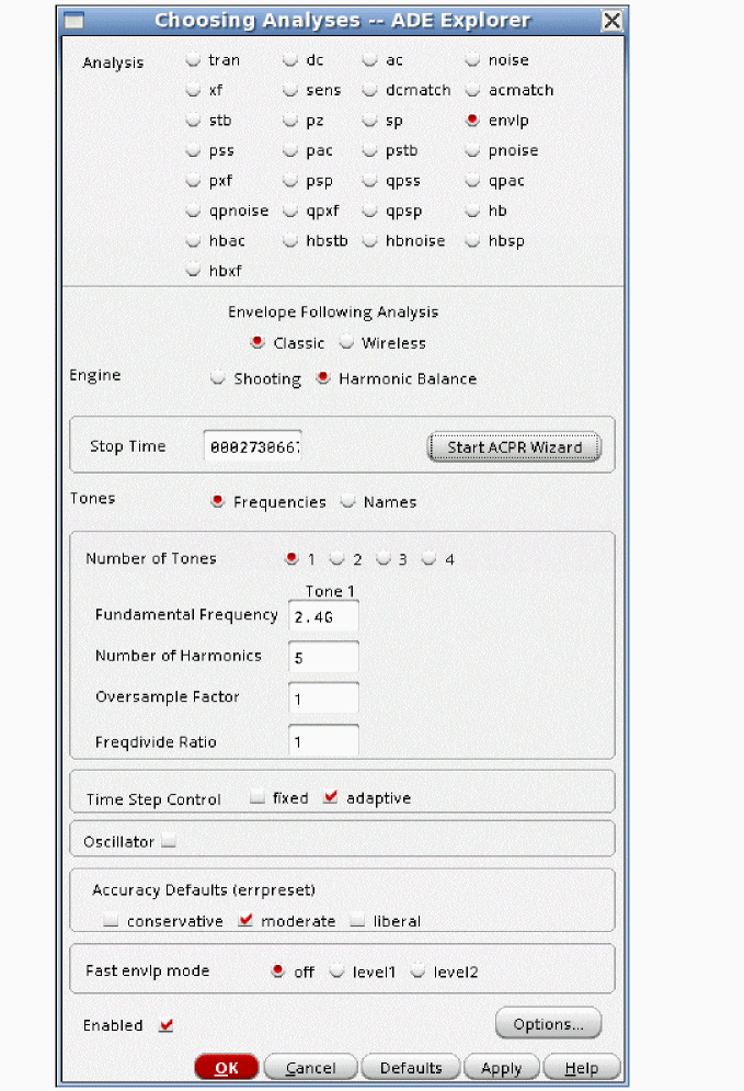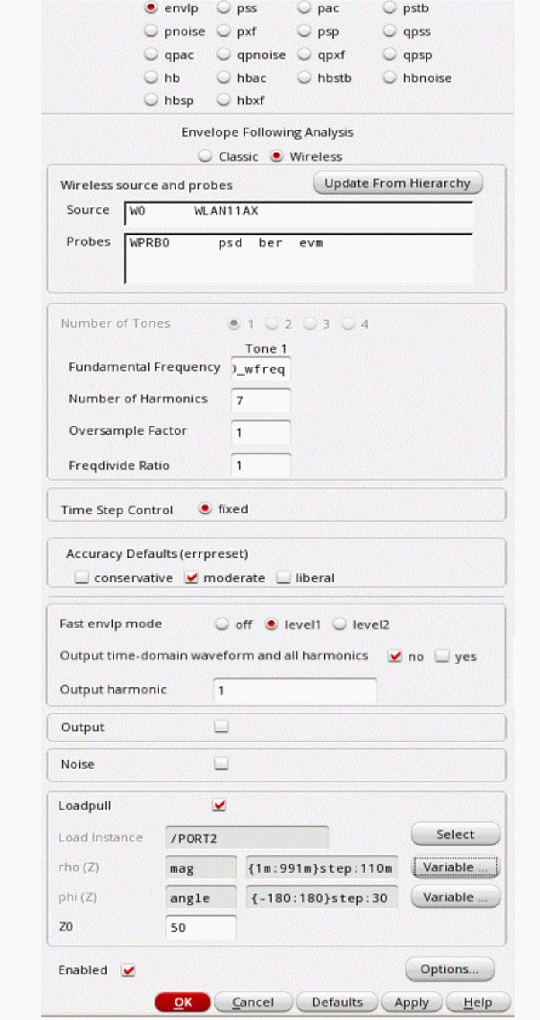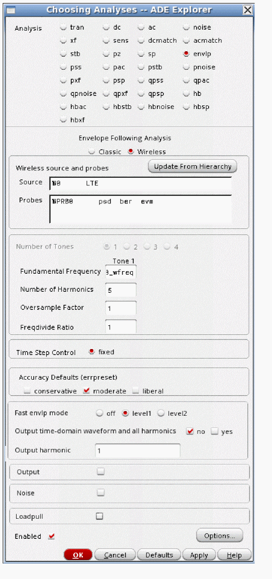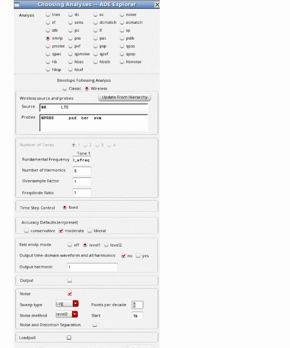 Next, select the wireless mode, and type in the number of harmonics you want to simulate. Generally, level1 or level2 fast envelope is used because of the speed advantage compared to transistor-level simulation. Both modes work with wireless.