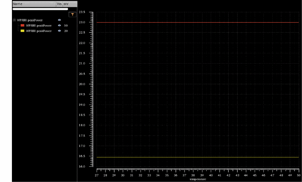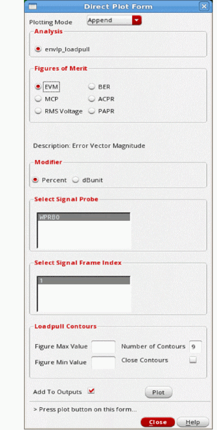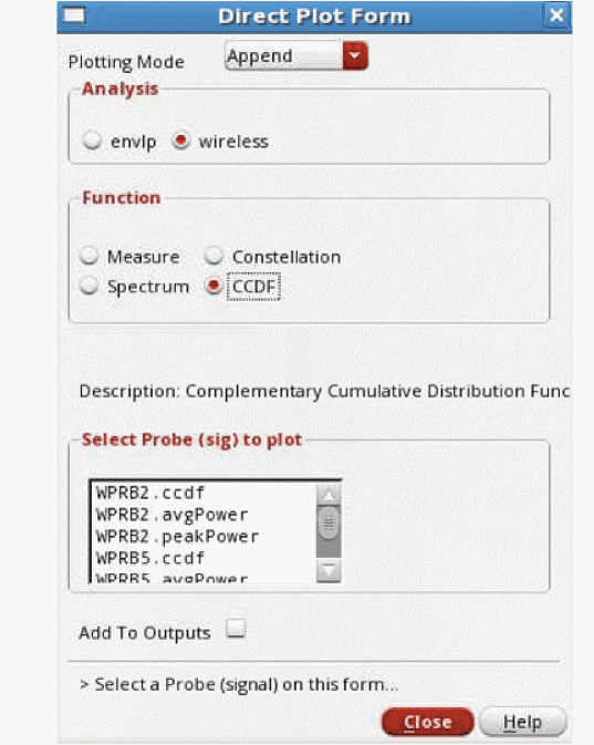 .avgPoweror.peakPowerprobe type is selected in the Direct Plot Form, there will be no option to plot the results because they are scalar values. Select the Add to Outputs check box to add these probes to the outputs as shown below:After adding the expressions to Outputs Setup tab, open the Results tab and click the Re-evaluate button to update the values in the results table.