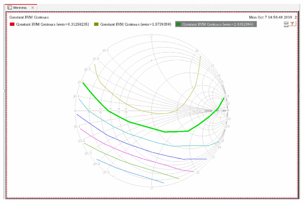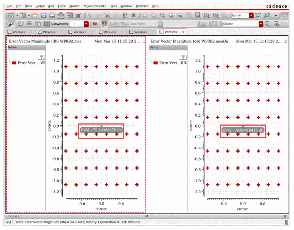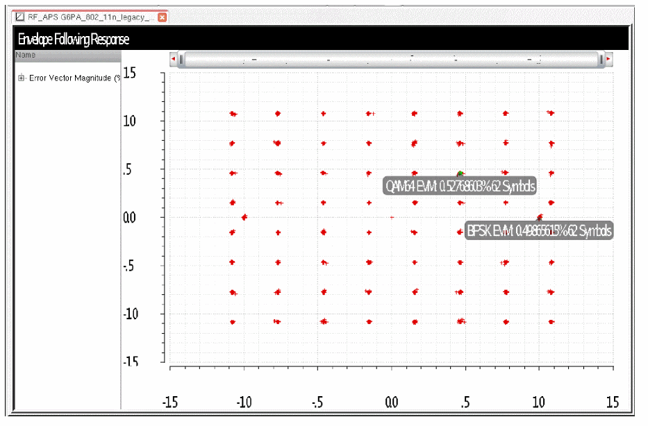 The constellation is displayed along with the EVM calculation. For the 802.11n standard, EVM for the data, pilot, or the weighted average of both is available.