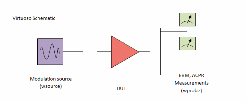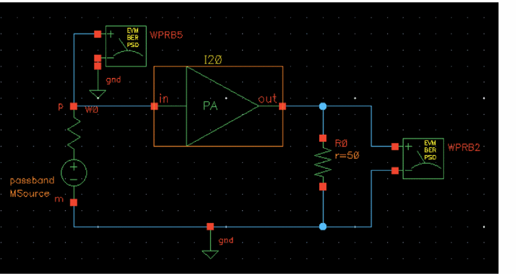 Consider a circuit with a wireless signal source, a behavioral PA, a wireless probe, and a 50 ohm resistor, as shown below. Multiple wireless probes are allowed. Connect a wireless probe at each point in the circuit you want to measure. The wireless source can be at any level in the hierarchy.