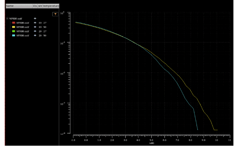 You can perform complementary cumulative distribution post processing (CCDF) for each probe placed in the circuit. Consider the following example design: