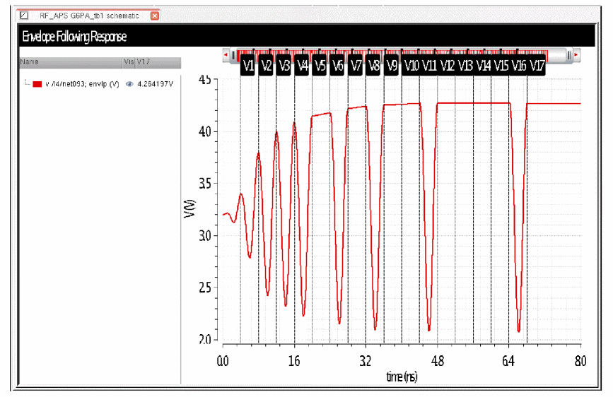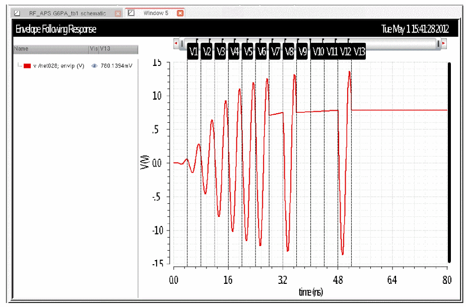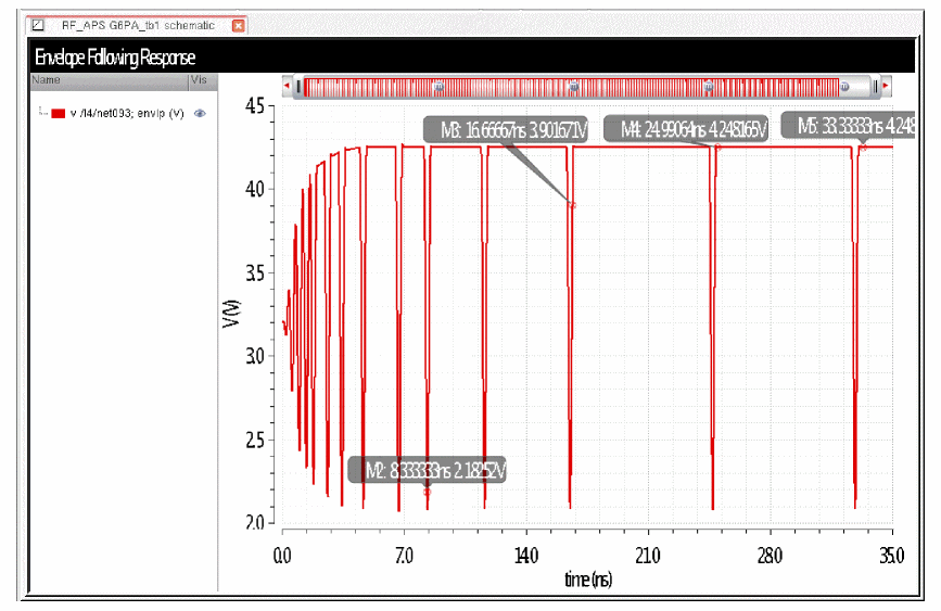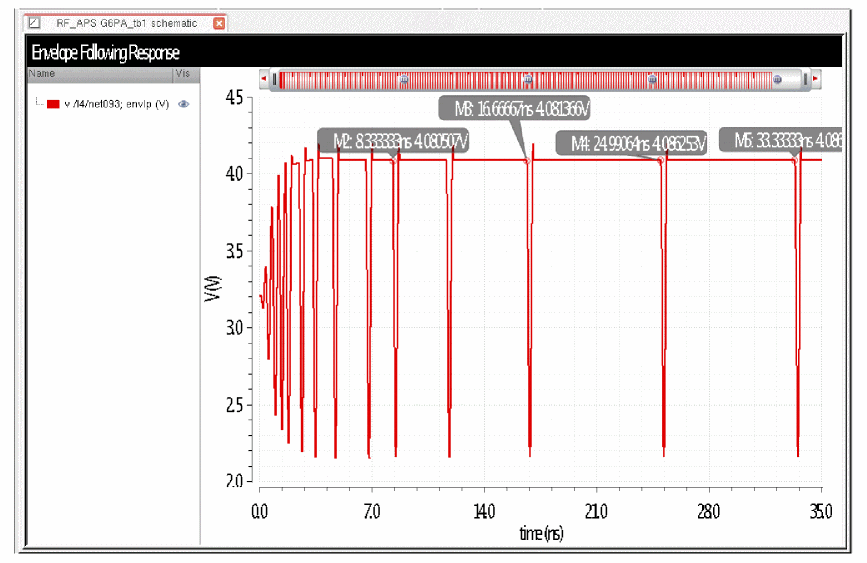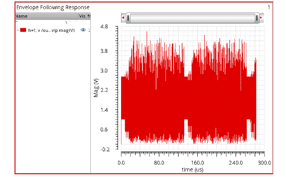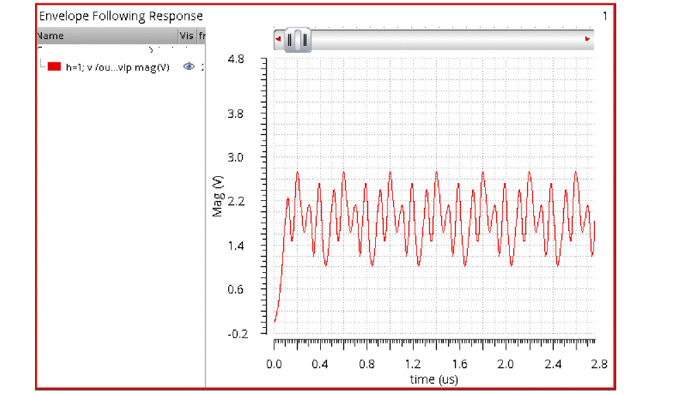 Envelope analysis is used instead of a transient analysis when there are fast things and slow things in the same circuit. The simulation term for this condition is called multi-rate simulation. In the transient, a large number of cycles of the fast signal must be simulated in order to capture the slow behavior in the circuit. Instead of simulating every fast cycle as in the transient, envelope skips many cycles of the fast signal because the change is very slow. Although many cycles are skipped, the result is almost as accurate as transient analysis.