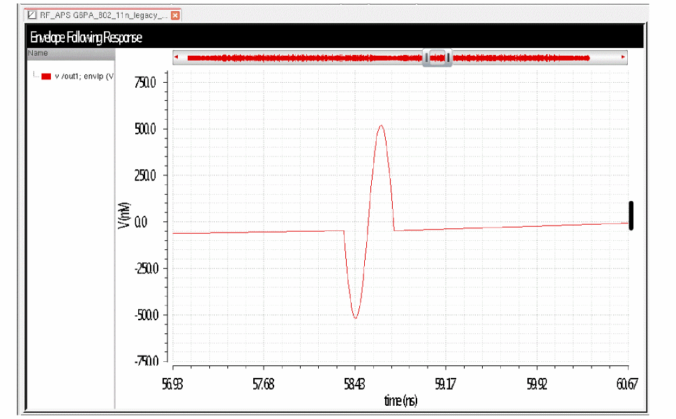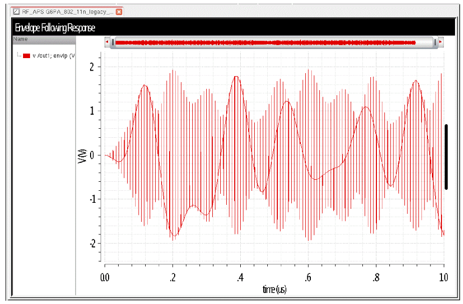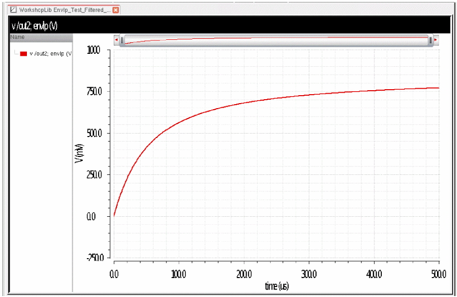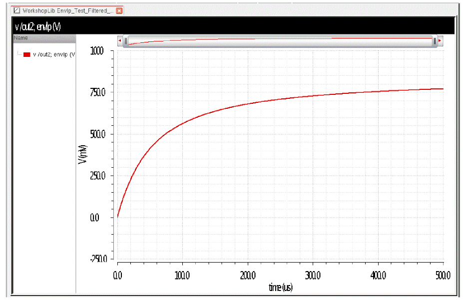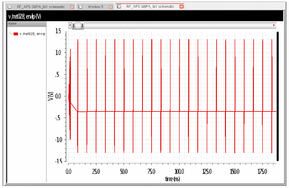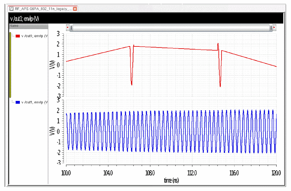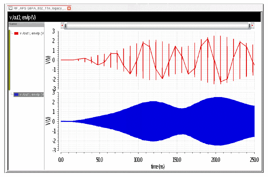If the envelope simulation had been steady-state at each time point, the voltage at the net out2 would have been constant and non-zero from the start.