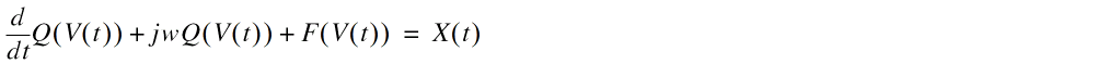 where V(t) is the vector of nodal harmonic envelopes. The remaining terms represent the quasi-static contributions to the envelope circuit equations, equivalent to a repeated solution of steady-state circuit equations by means of harmonic balance, one for each envelope time step ti, where the sources are treated as sinusoids having a time-varying complex amplitude X(ti).