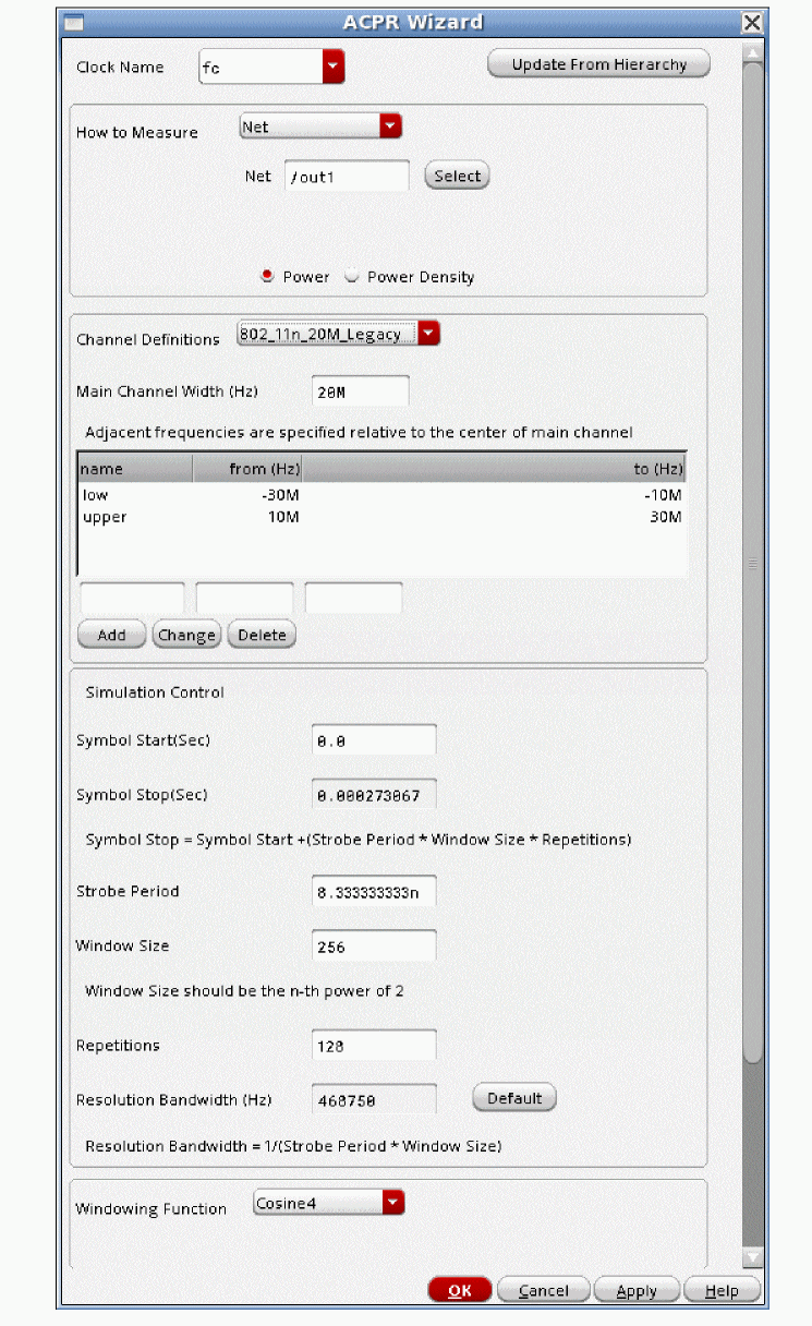 To plot the high and low acpr measurements at higher frequency offsets, select Customized ACPR in the Direct Plot Form and specify the number of channels in the Number of Adjacent Channels field, as shown below.