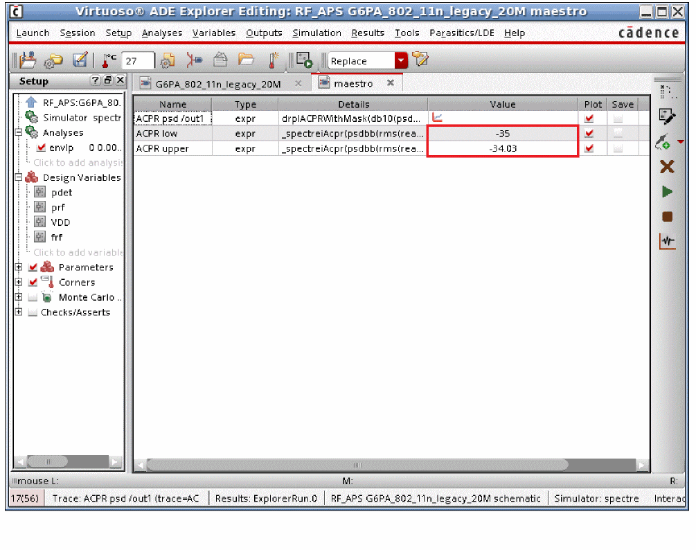 Click Plot. The high and low acpr measurements at higher frequency offsets are displayed using markers.