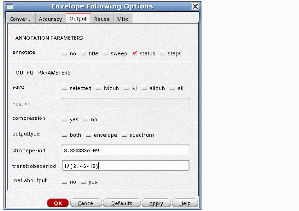 Normally, the time-domain waveform is a cycle of carrier followed by many skipped cycles, followed by another cycle of simulation. Since there is no waveform between the last point for the first cycle and the first point of the second cycle, the waveform tool just connects those points together with a straight line. The waveform can be made into a continuous waveform using the transtrobeperiod option. This should be set to an integer fraction of one period of the carrier frequency. When this is set, Spectre still skips cycles, but it also creates an interpolated, continuous waveform with time points at the transtrobeperiod interval. In the example below, 20 points are set for one period of the carrier at 2.5G.