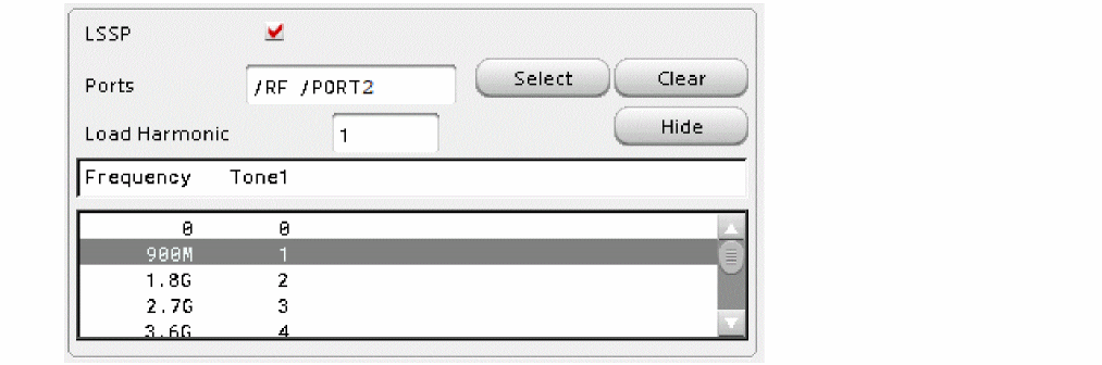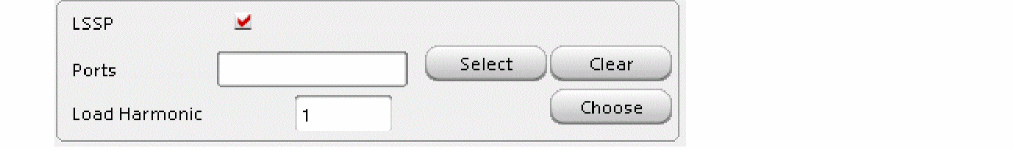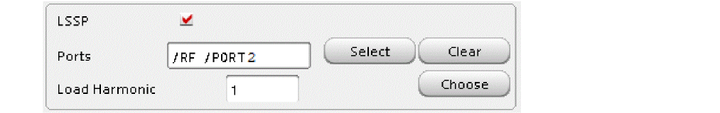 LSSP expects that a variable is used to set the input power. The normal setup is to specify the input power sweep as normal and then select the LSSP check box in the Choosing Analyses form. When this is chosen, you define the source and load ports in the Ports field, and you select the frequency of the output in the Load Harmonic field. The output frequency defines the frequency for the forward S21 measurement, and the frequency of port 2 for the S22 and S12 measurements. Set the output Source type to sine with no properties to define the frequency or amplitude.