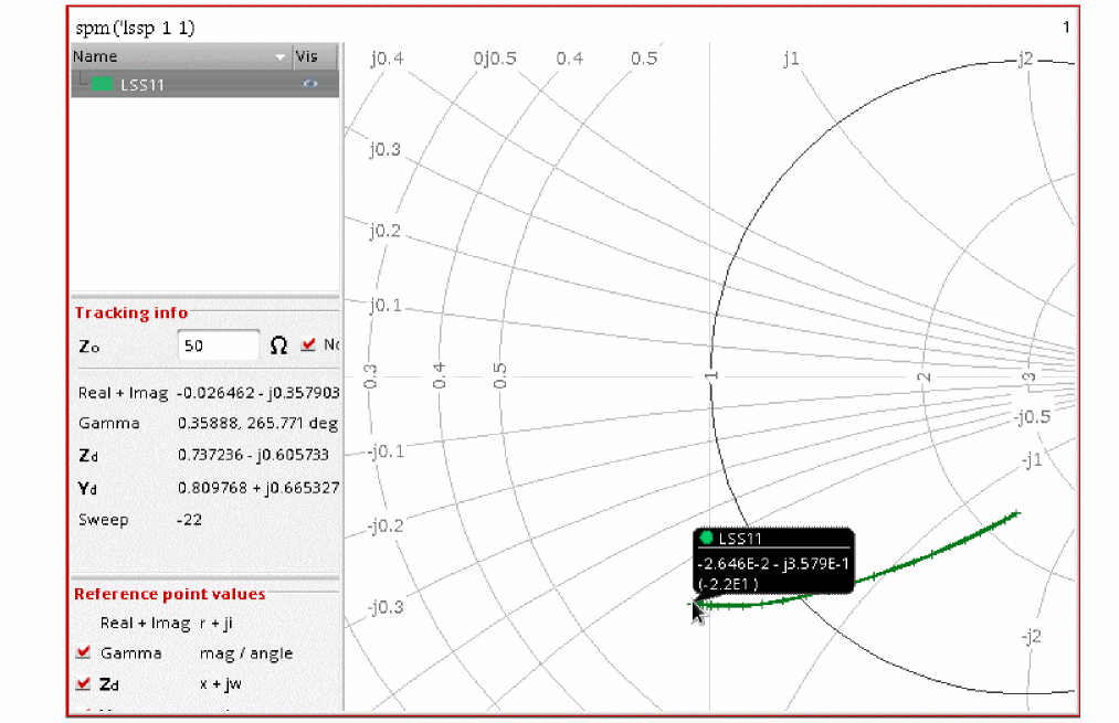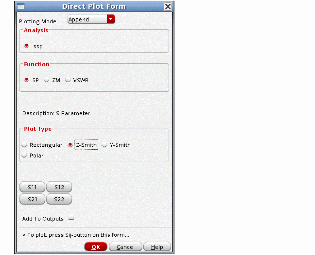 Starting with the MMSIM13.1 release, the LSSP capability has been integrated into the hb and pss (shooting and hb) Choosing Analyses form. With this integration, the simulation is now much easier to set up, and allows the input and output frequencies to be different. Direct plot functions have also been implemented to allow plotting the large-signal S-Parameters on a Smith Chart. When these expressions are added under the Maestro tab of the ADE Explorer window from the Direct Plot Form, ADE Explorer plots the output on the Smith Chart.