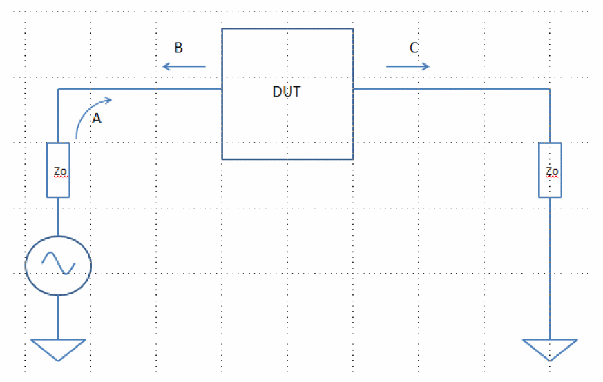 For a wave A launched from port1 on the left, S11 is B/A, and S21 is C/A, where A, B, and C are all vectors. When this measurement is done, the power in the load resistor is calculated.