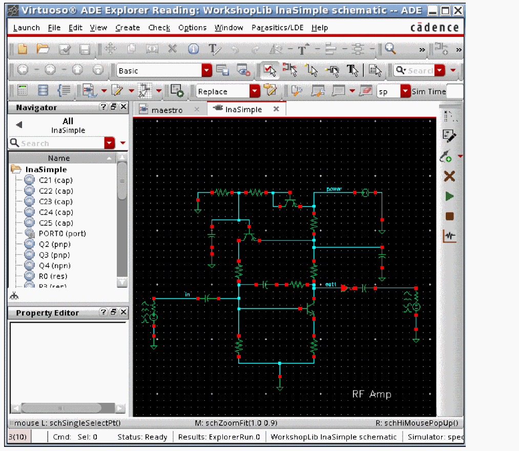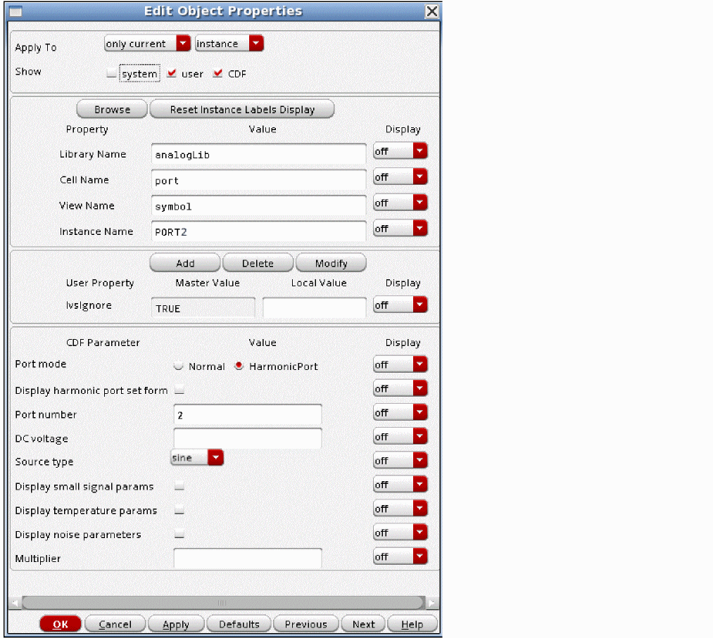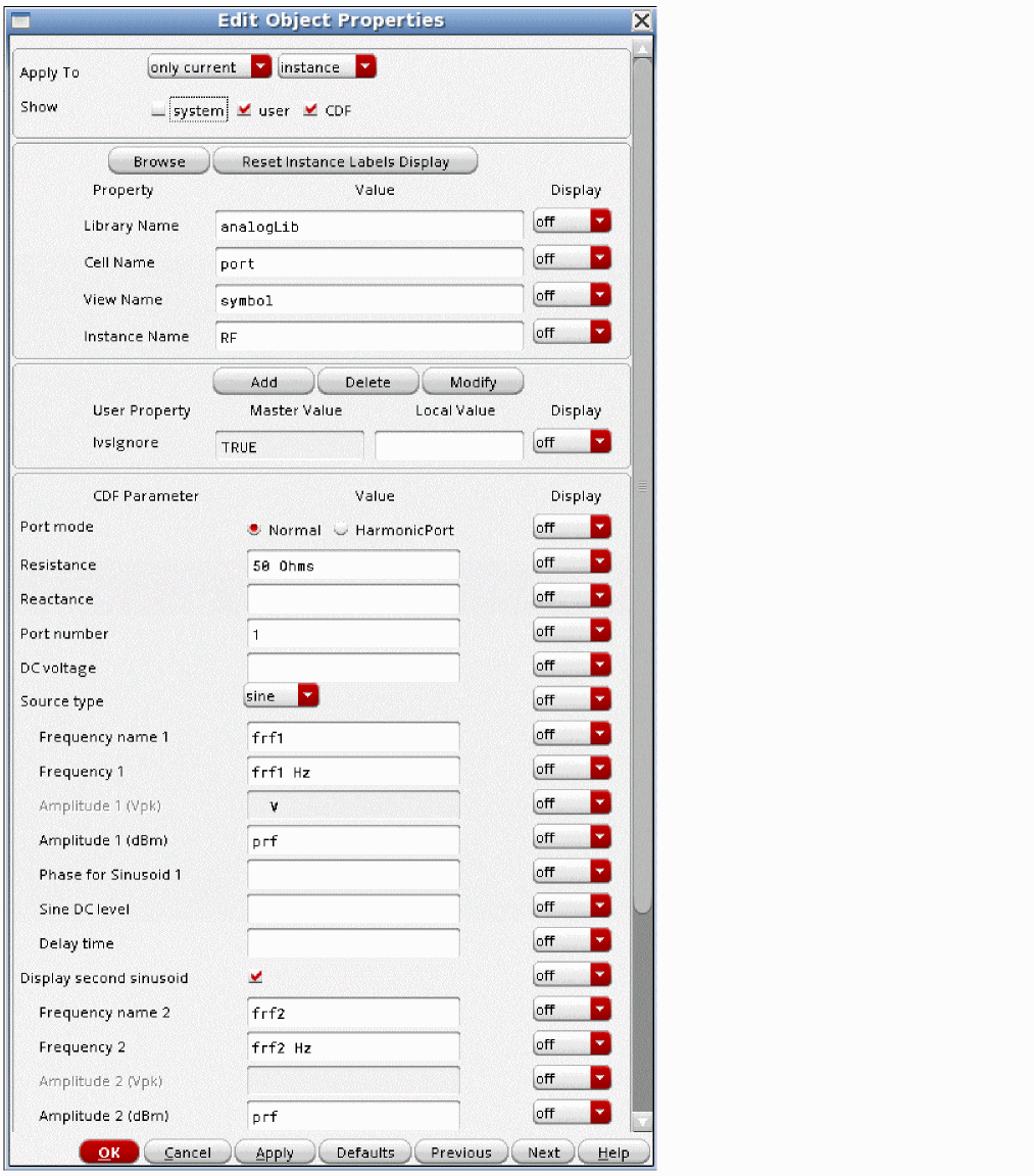 Note that the input source is set to produce two RF signals. Both signals have frequencies that are set by the variables frf1 and frf2. The amplitude of both signals are set to the variable name prf. This is a common way to set sources because it allows changing the frequencies and amplitudes using variable names in ADE Explorer without needing to change the schematic.