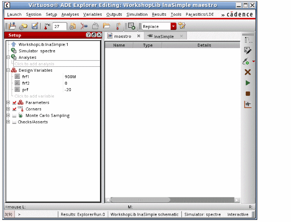 The ADE Explorer setup is shown below with the variables defined in the Design Variables section.
