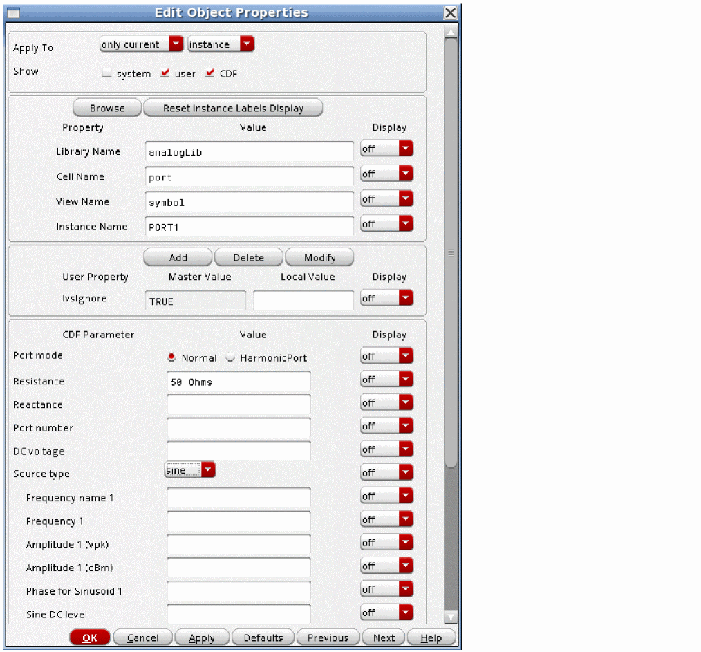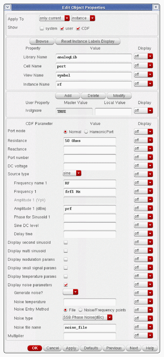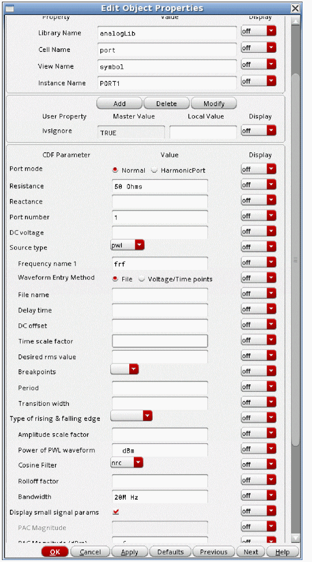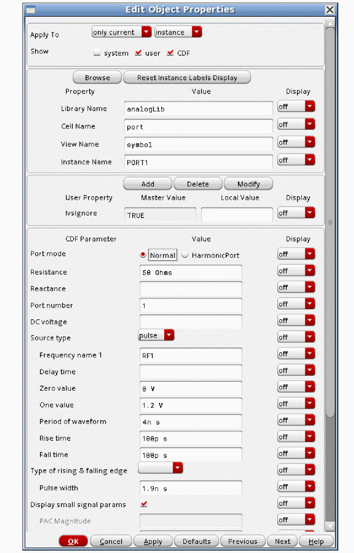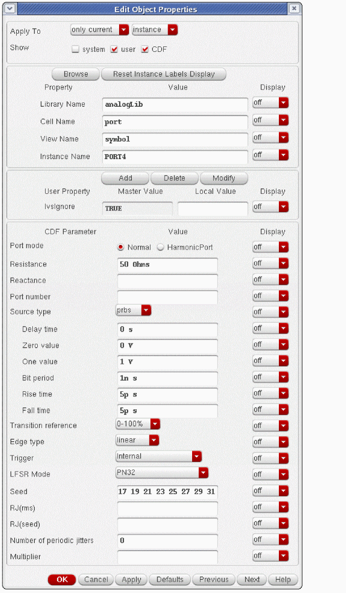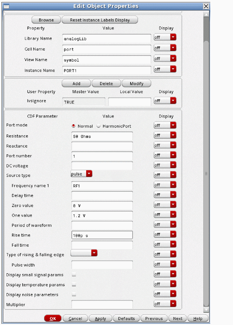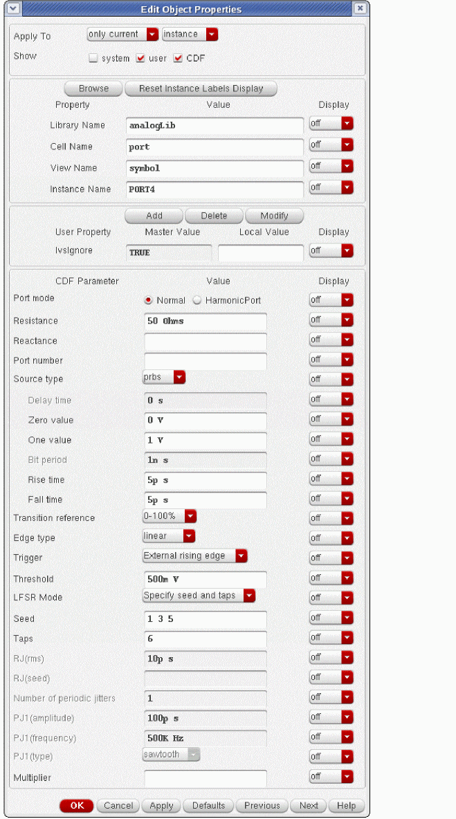 The port component, located in the analogLib library, is a superset of the existing psin component. The port component supports all the source types of the Spectre port primitive: pwl, pulse, sine, dc, and exp. In addition, it includes the bit and prbs source types. If you are using the psin component, it is highly recommended that you switch to the port component because the properties are organized in a better way, and the levels in volts peak and in dBm both cannot be set at the same time. This is easily accomplished by obtaining the properties form for psin, and changing the cell name to port. All the properties that are set in the psin component will retain their values when you make the change.