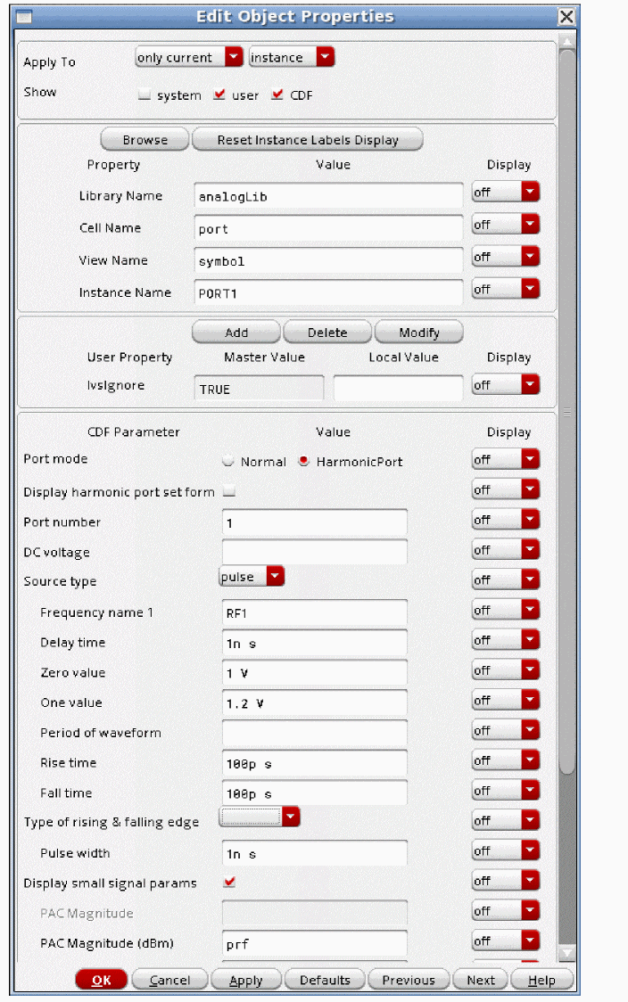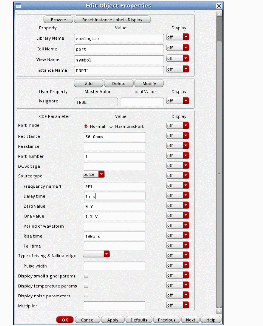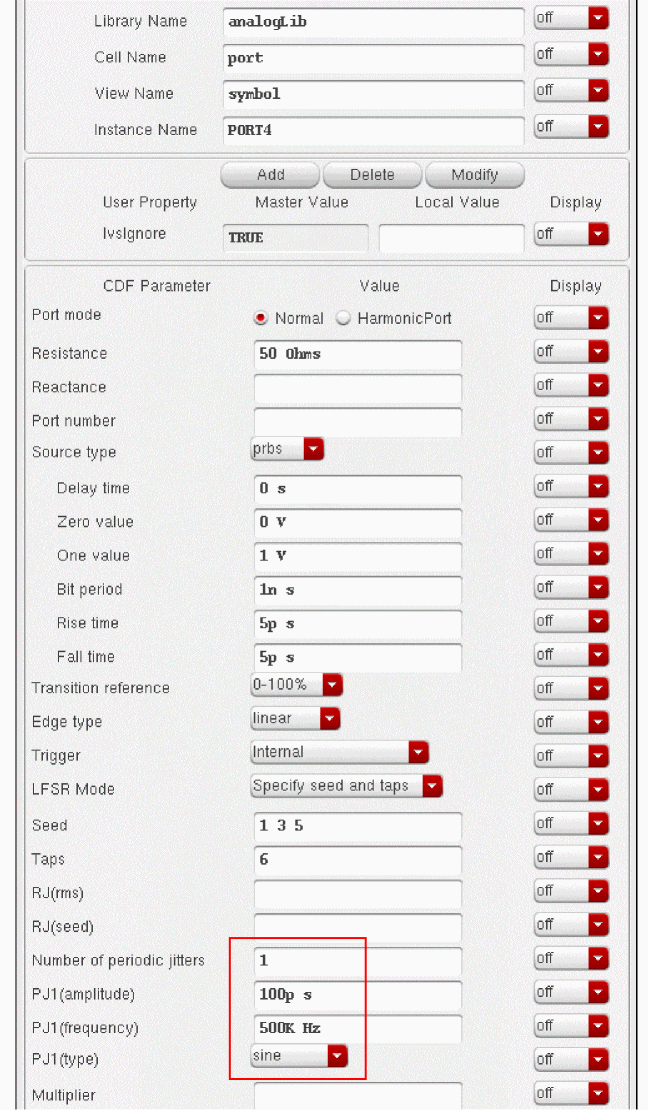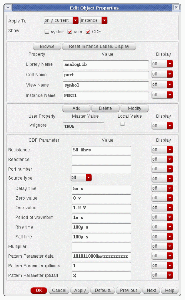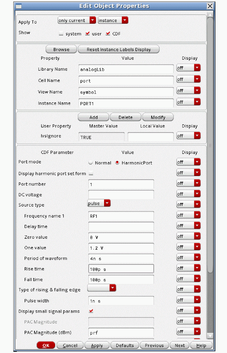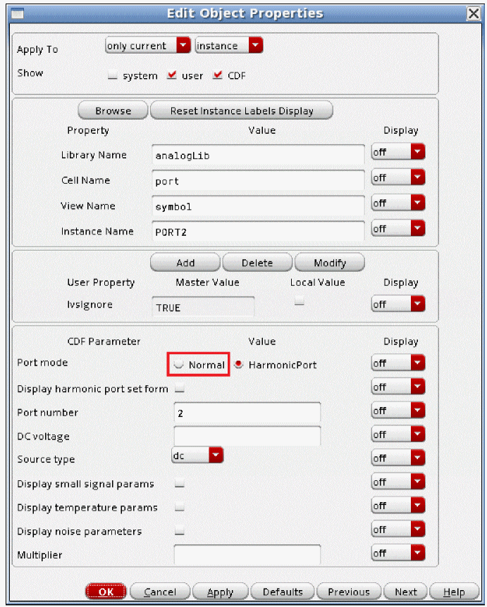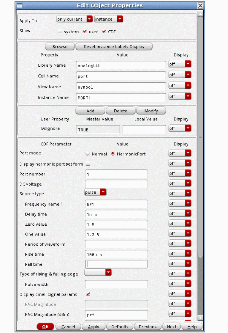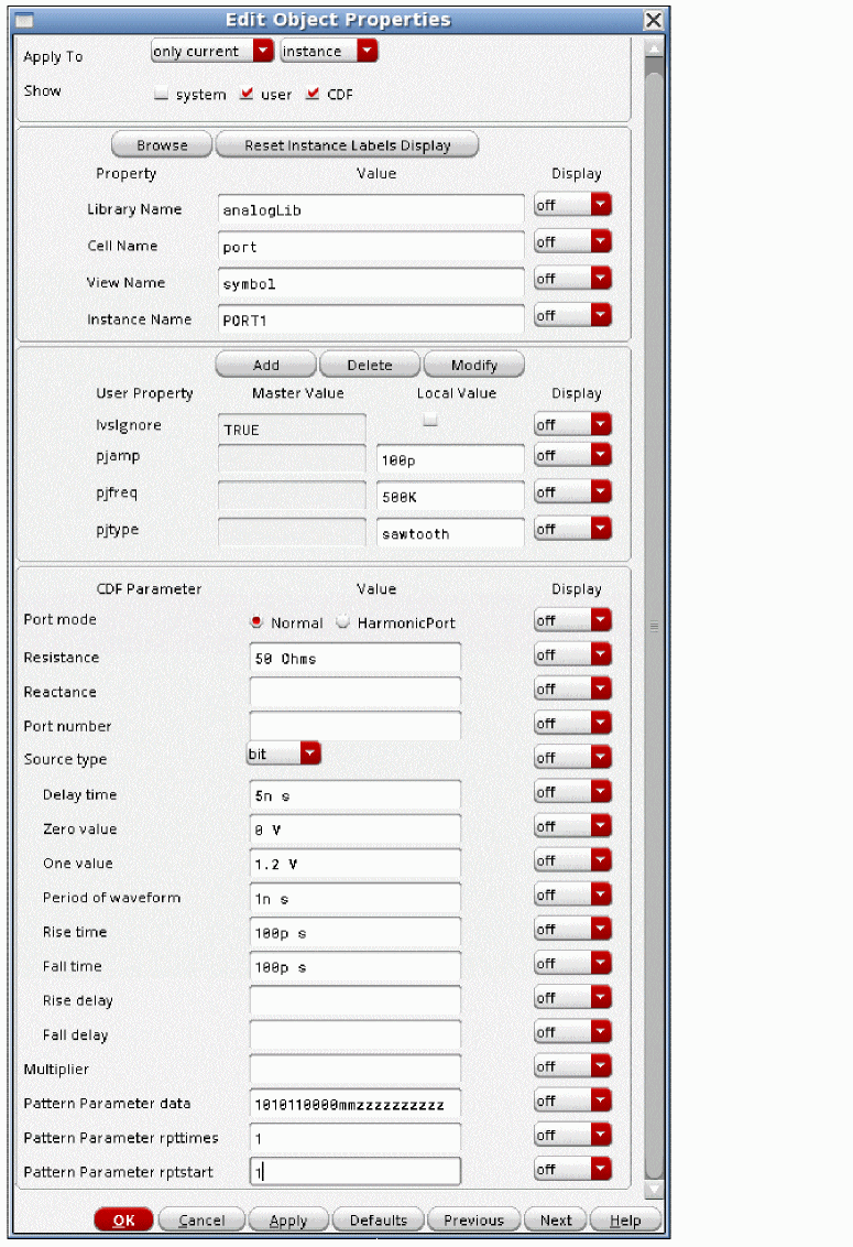 The port component, located in the analogLib library, is a superset of the existing psin component. The port component supports all the source types of the Spectre port primitive: pwl, pulse, sine, dc, and exp. In addition, it includes the bit and prbs source types. If you are using the psin component, it is highly recommended that you switch to the port component because the properties are organized in a better way, and the levels in volts peak and in dBm both cannot be set at the same time. This is easily accomplished by obtaining the properties form for psin, and changing the cell name to port. All the properties that are set in the psin component will retain their values when you make the change.