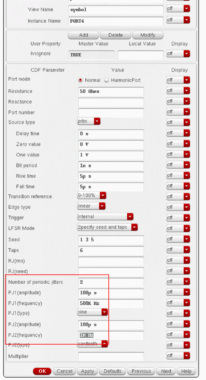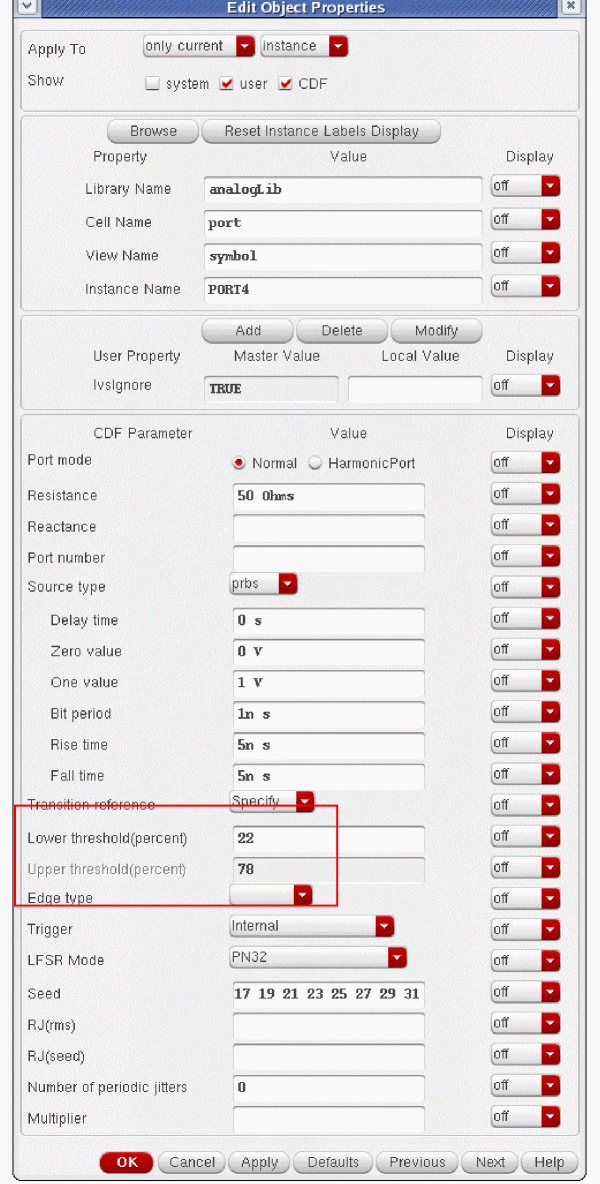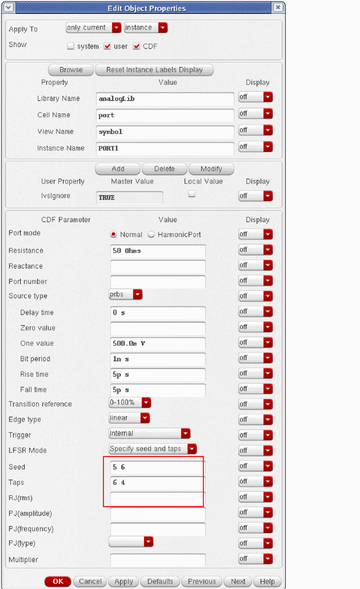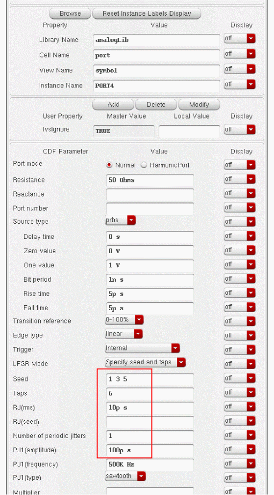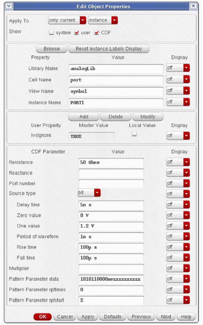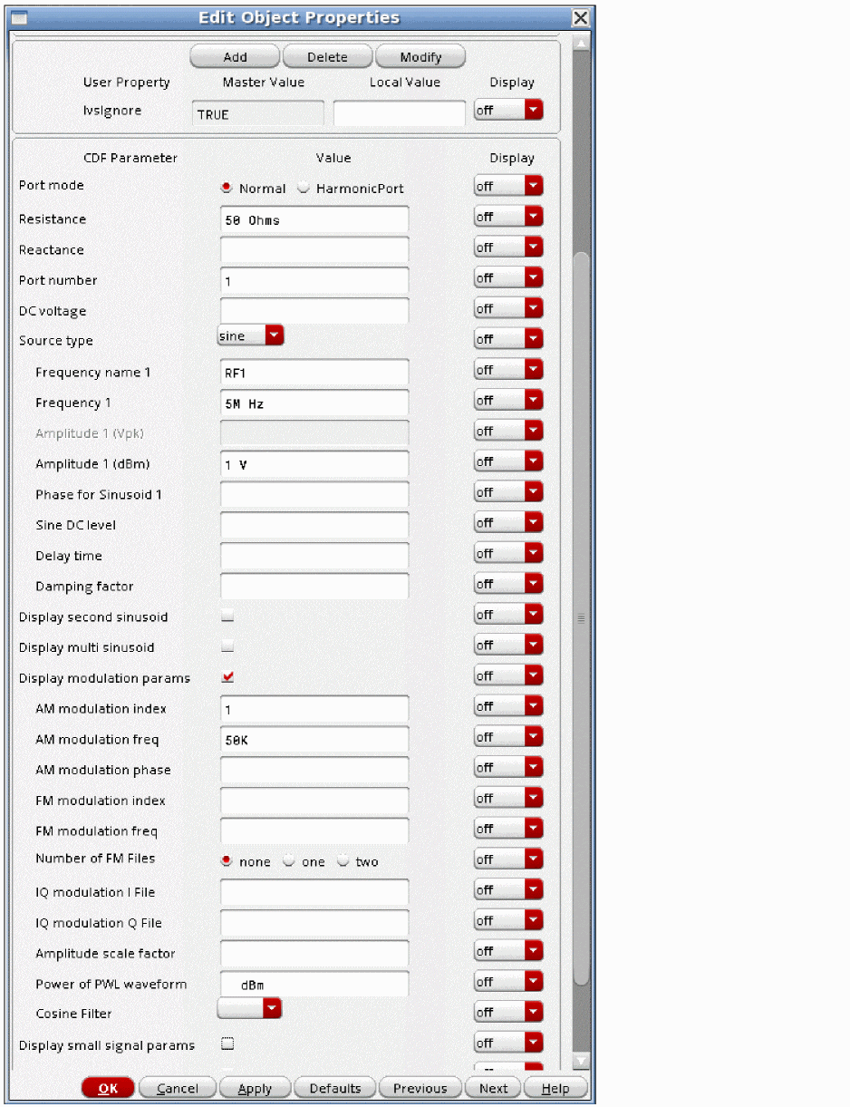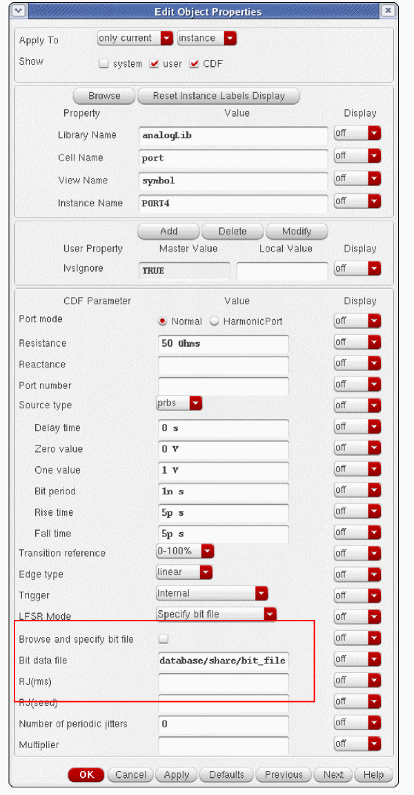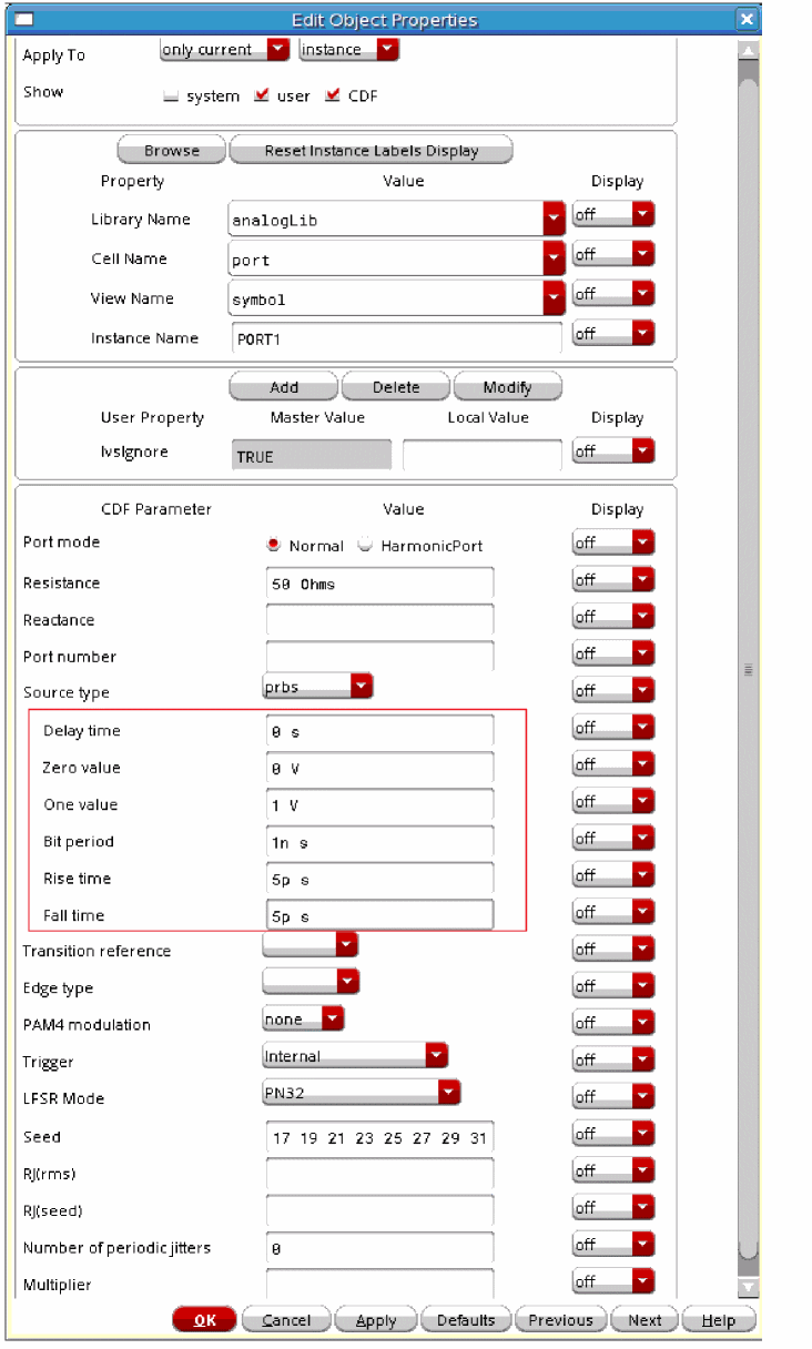 The port component, located in the analogLib library, is a superset of the existing psin component. The port component supports all the source types of the Spectre port primitive: pwl, pulse, sine, dc, and exp. In addition, it includes the bit and prbs source types. If you are using the psin component, it is highly recommended that you switch to the port component because the properties are organized in a better way, and the levels in volts peak and in dBm both cannot be set at the same time. This is easily accomplished by obtaining the properties form for psin, and changing the cell name to port. All the properties that are set in the psin component will retain their values when you make the change.