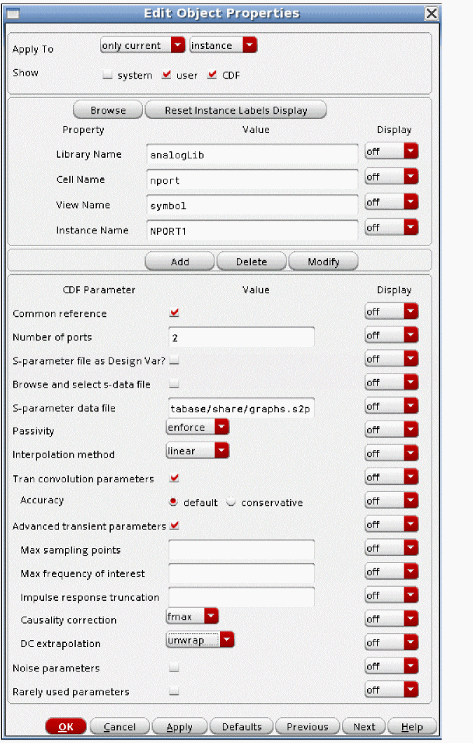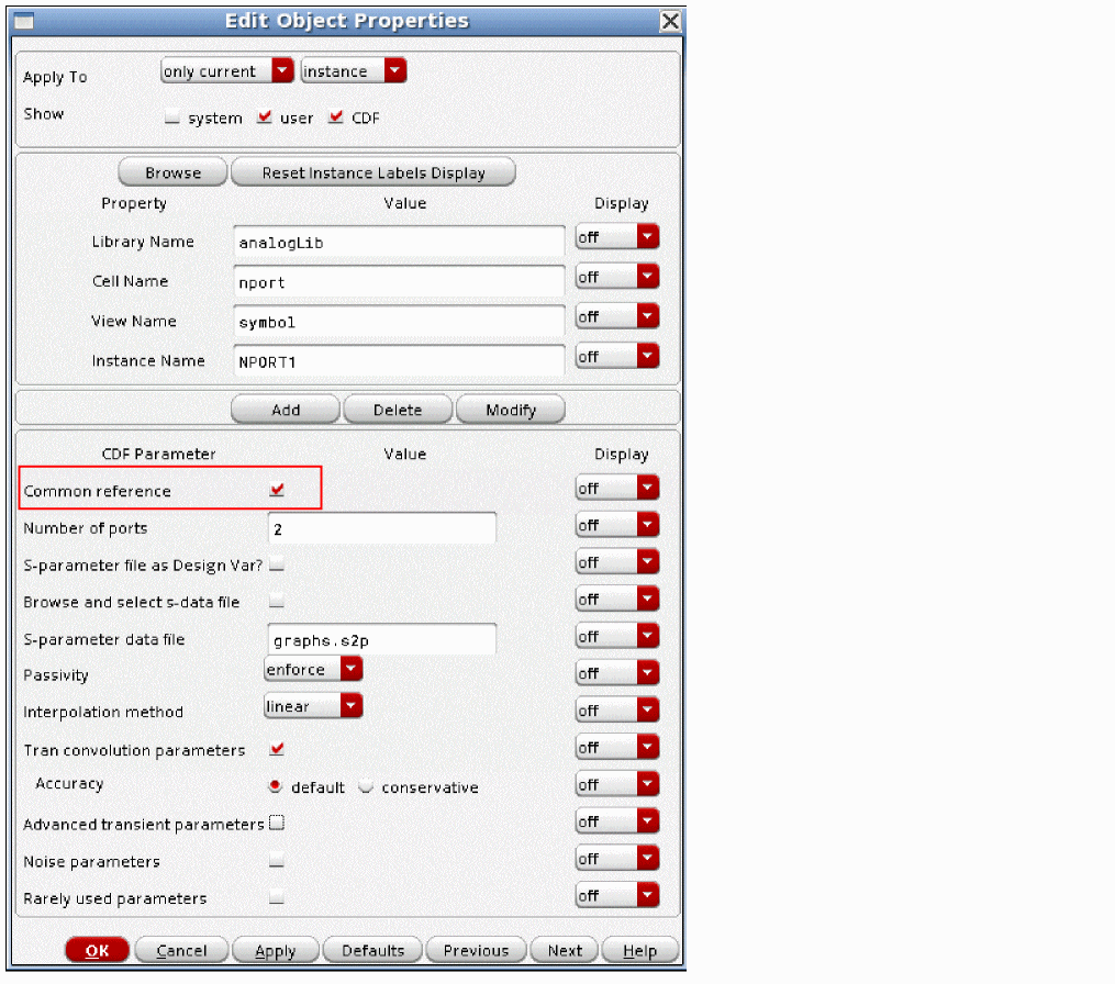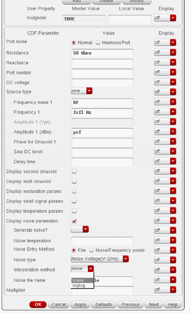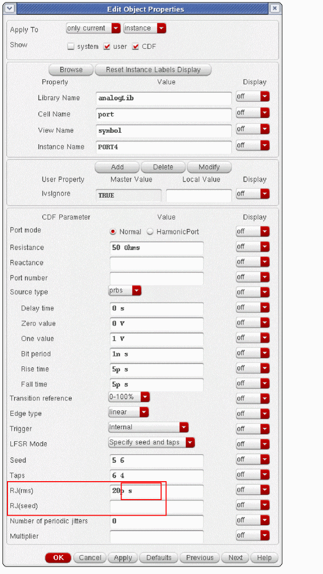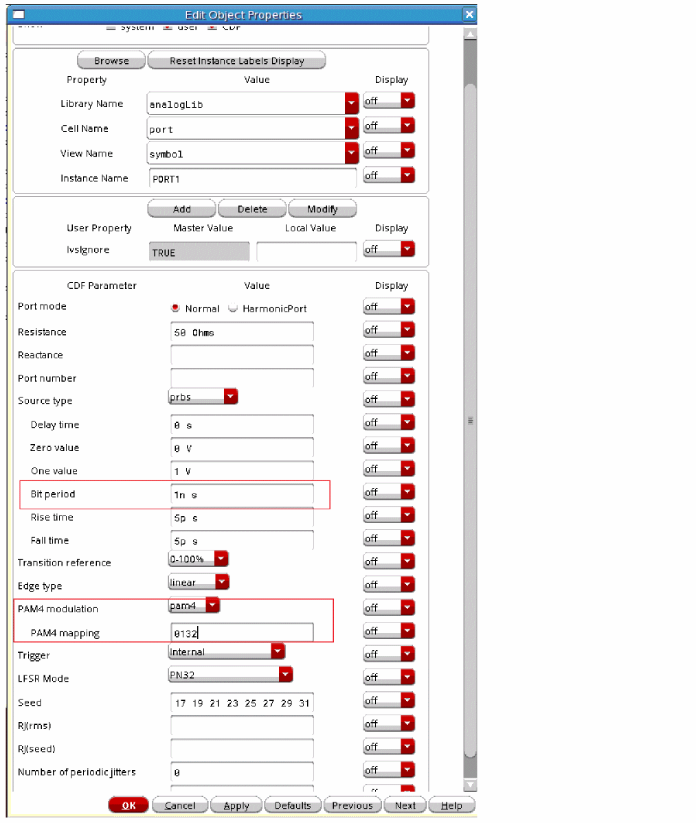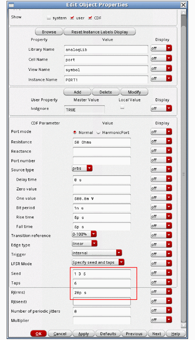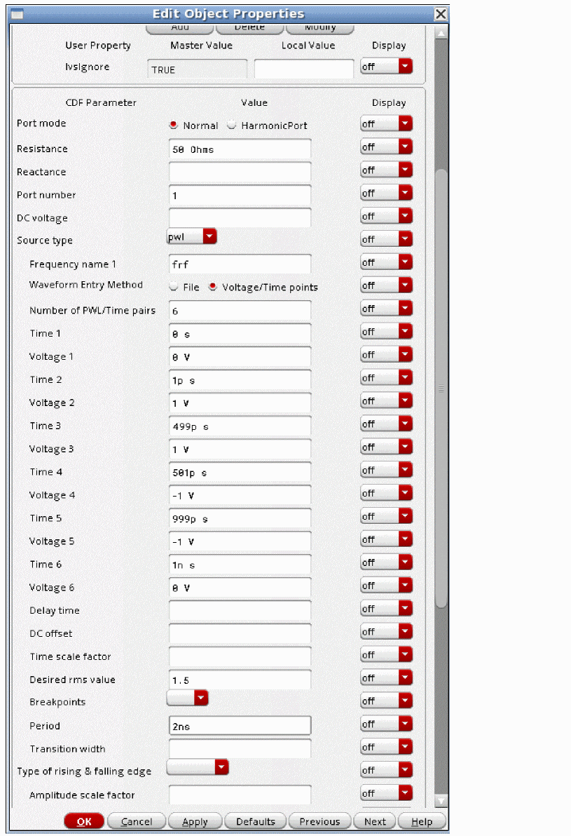 The port component, located in the analogLib library, is a superset of the existing psin component. The port component supports all the source types of the Spectre port primitive: pwl, pulse, sine, dc, and exp. In addition, it includes the bit and prbs source types. If you are using the psin component, it is highly recommended that you switch to the port component because the properties are organized in a better way, and the levels in volts peak and in dBm both cannot be set at the same time. This is easily accomplished by obtaining the properties form for psin, and changing the cell name to port. All the properties that are set in the psin component will retain their values when you make the change.