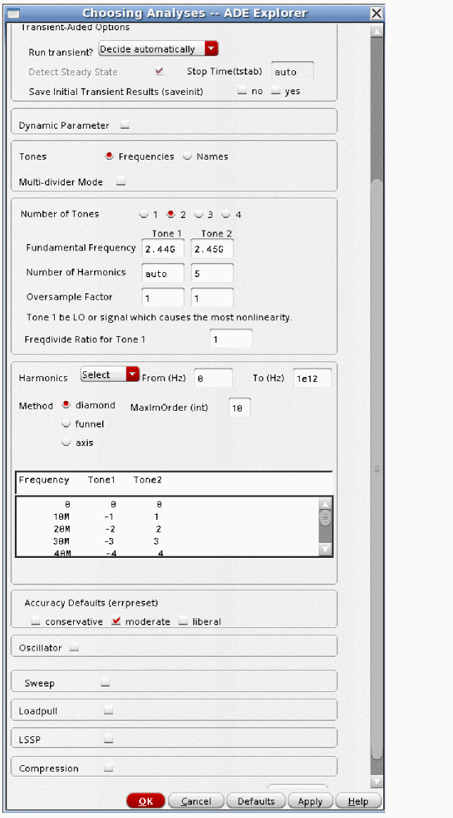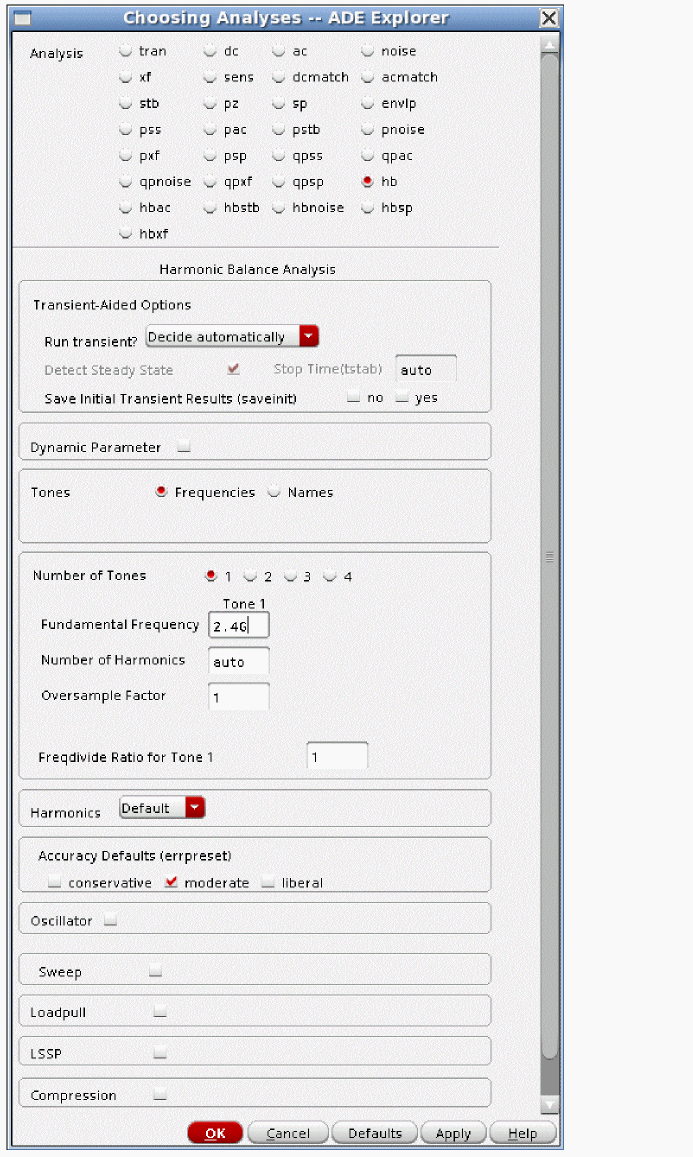 Now the harmonic balance Choosing Analyses form has two frequencies.