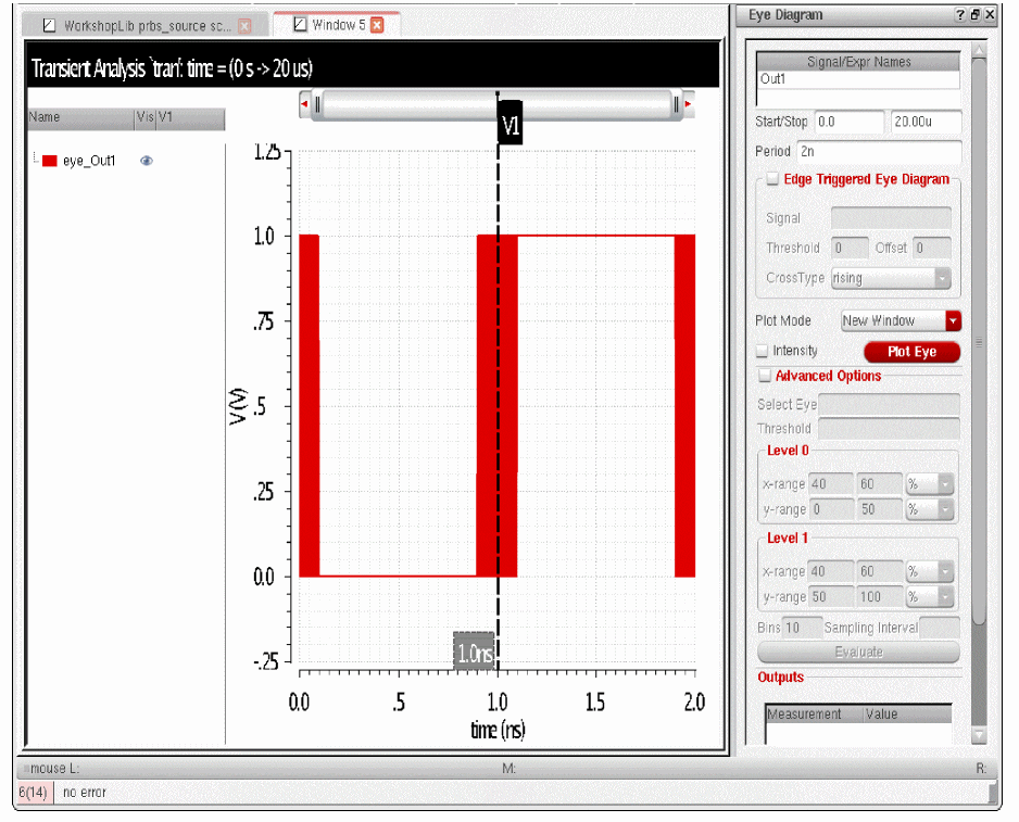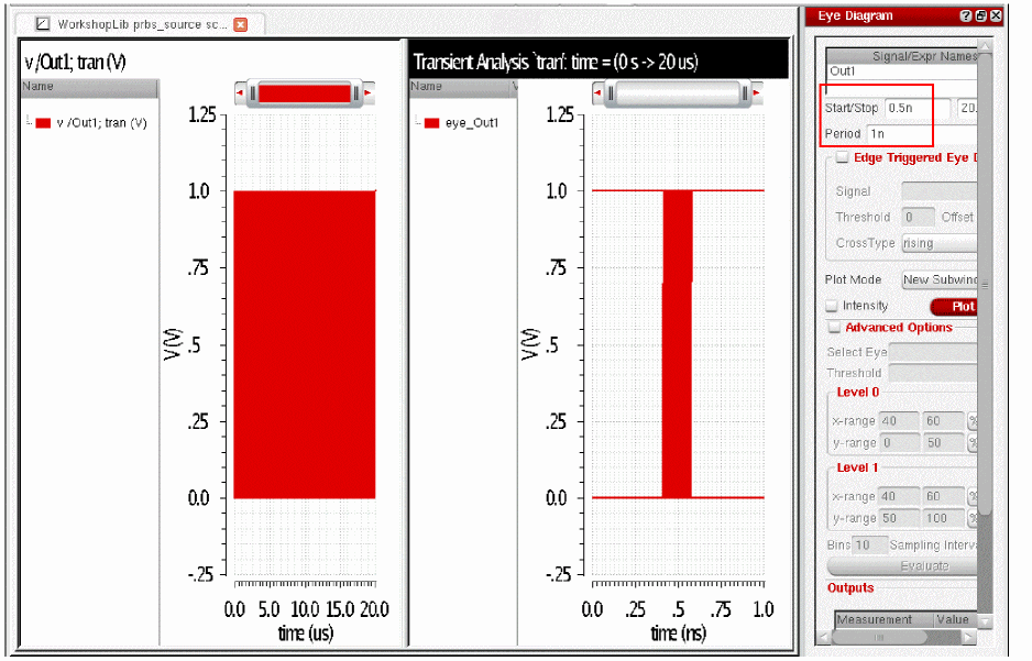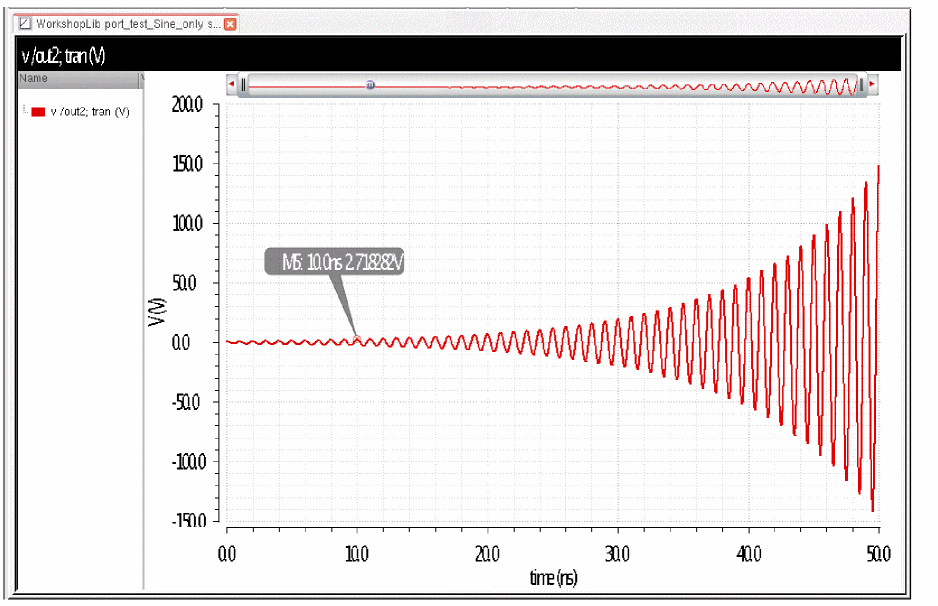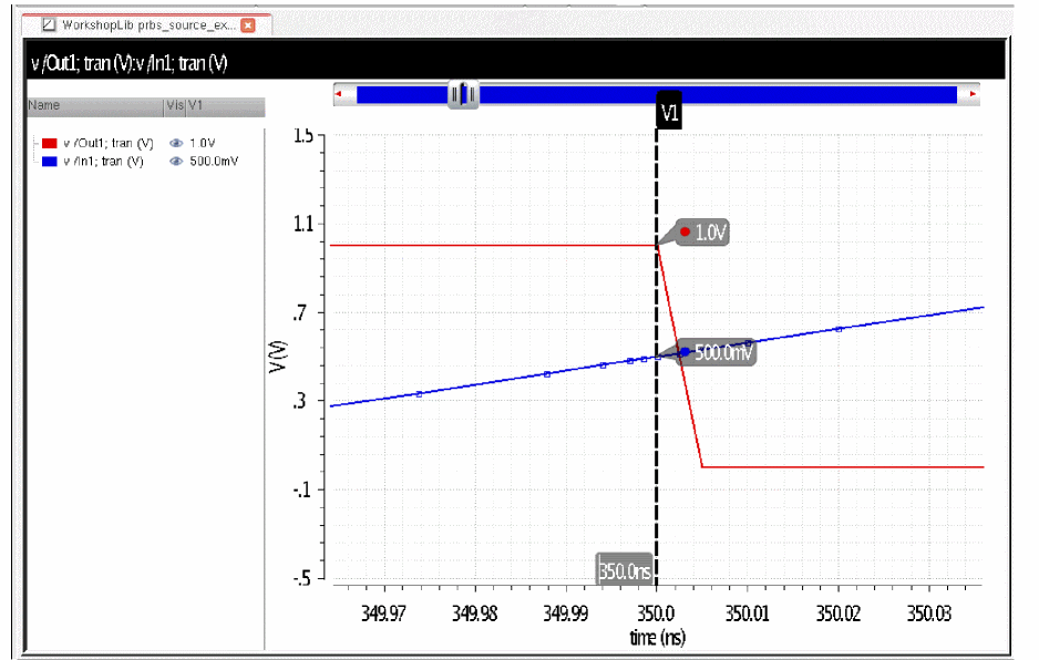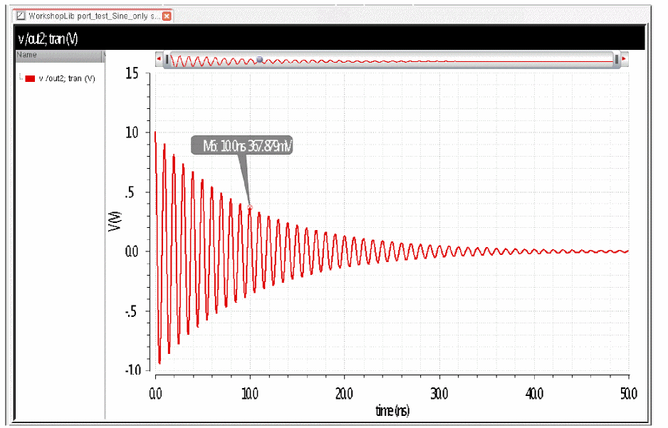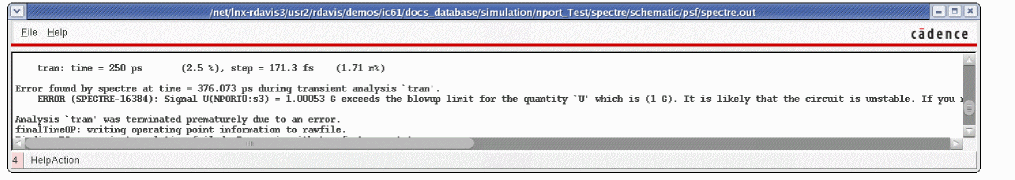 When you specify the voltage on a port, all Spectre simulations assume that the port is properly terminated in it’s reference resistance. The specified voltage value is not the voltage on the internal voltage source, which is actually set to twice the value specified on the port. If you use a port source to drive an open circuit, the voltage (for DC, transient, AC, and PAC signals) is double its specified value. However, you can alternatively specify the amplitude of the sine wave in the transient and PAC analyses as the power in dBm delivered by the port when terminated with the reference resistance. For the bit and prbs source, the voltages specified for the zero and one states are doubled inside the port as usual. For the prbs source, you can add a matching resistor across the port to get the voltages specified in the zero and one states, or you can omit the resistor, and half the desired voltages. For the bit source, if you intend to use the z state, do not add a matching resistor across the source because this small resistor will totally swamp the Z-state effect. Thus, when you use the bit source in a port, the values for the zero and one states should be half the desired voltages. This is not an issue for the vsource element.