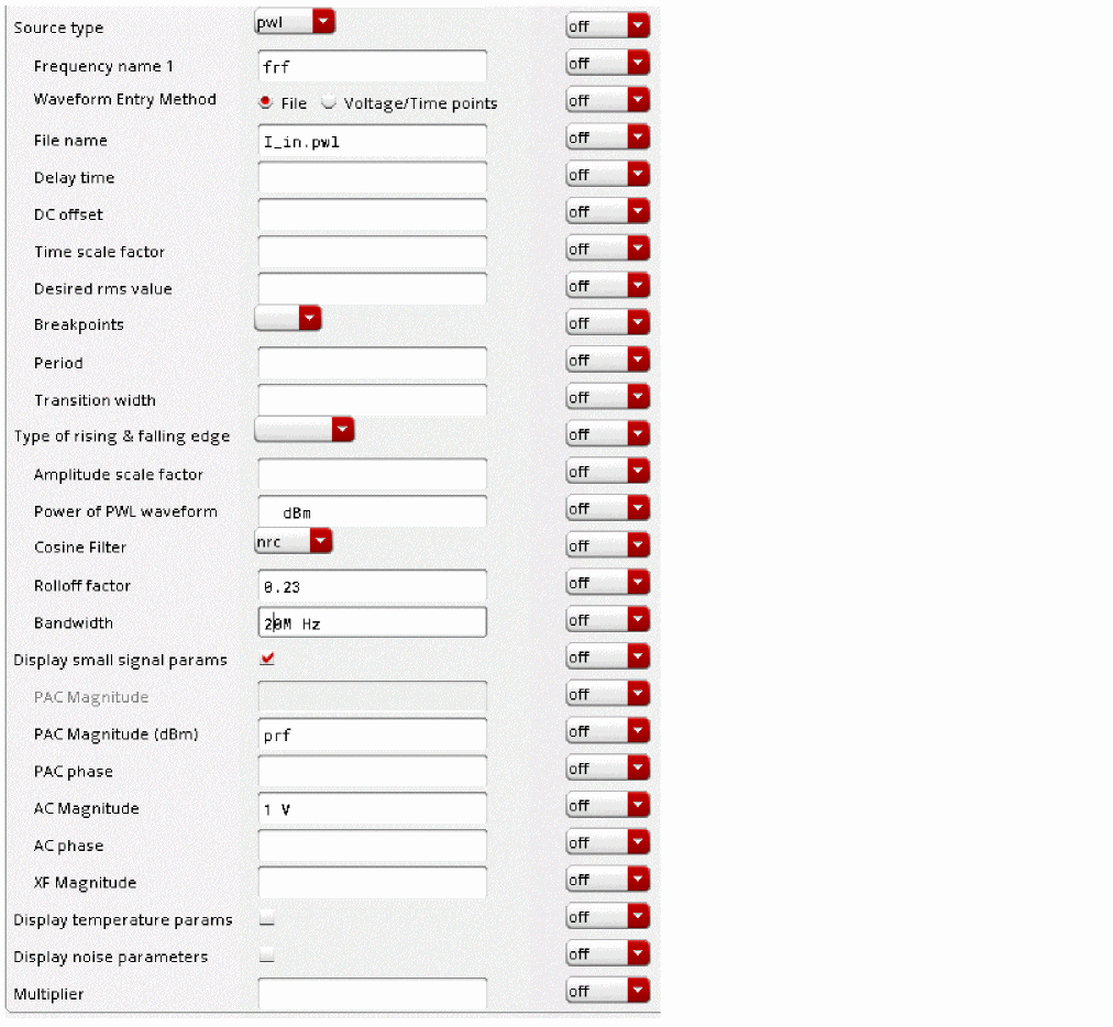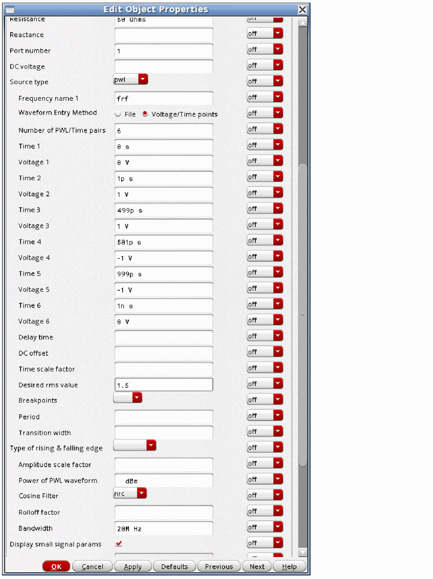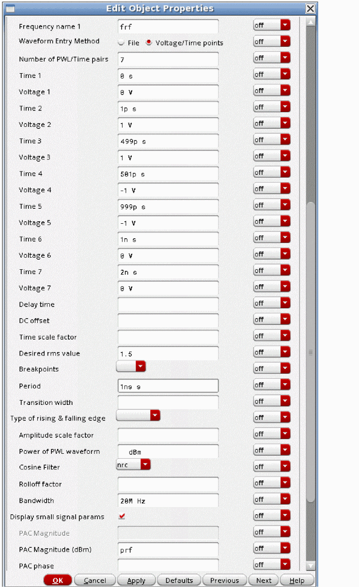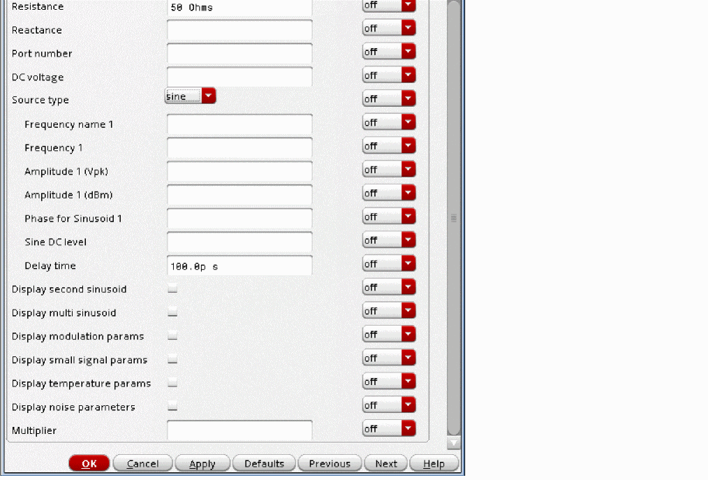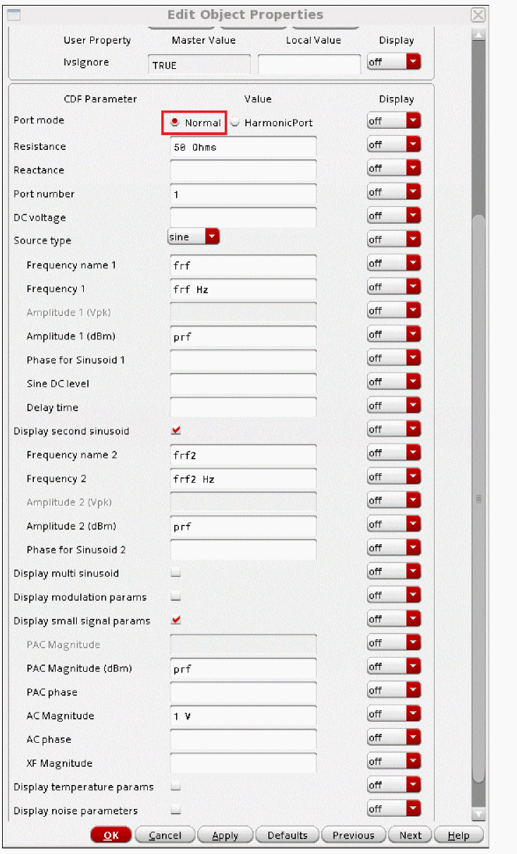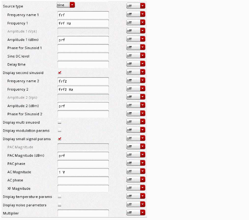 The typical Source types used in SpectreRF analyses are: dc, piecewise linear, pulsed, and sine. For example, you can quickly switch from a sinusoid (for PSS analysis) to a DC level (for PAC analysis) by changing the Source type from sine to dc. The sinusoidal properties remain with the port, and can be changed when the Source type is returned to sine. This is true when switching between any of the sourcetypes. All the properties are retained for everything that you define.