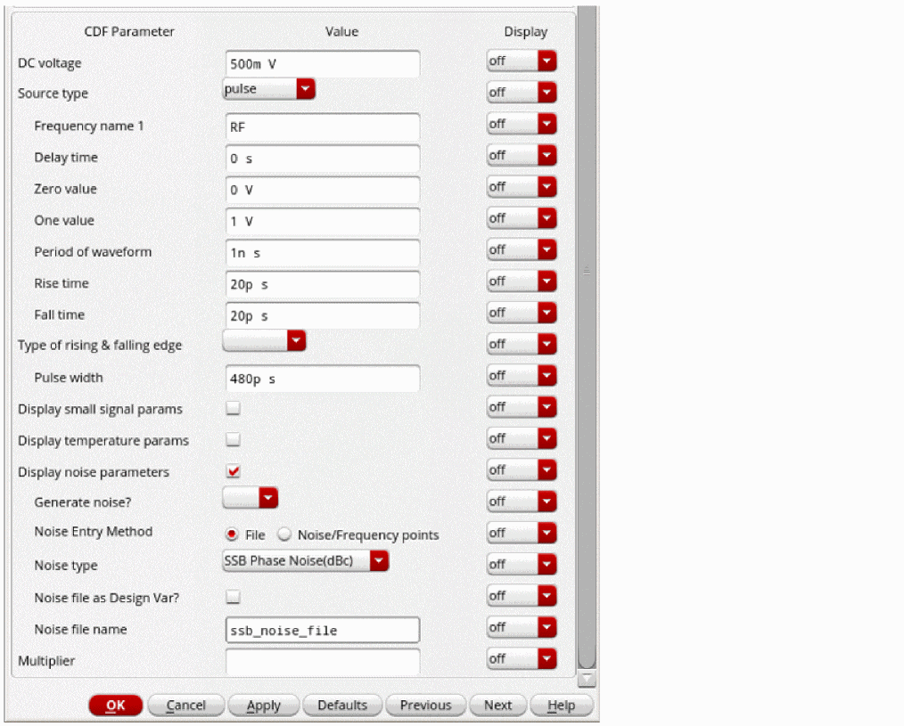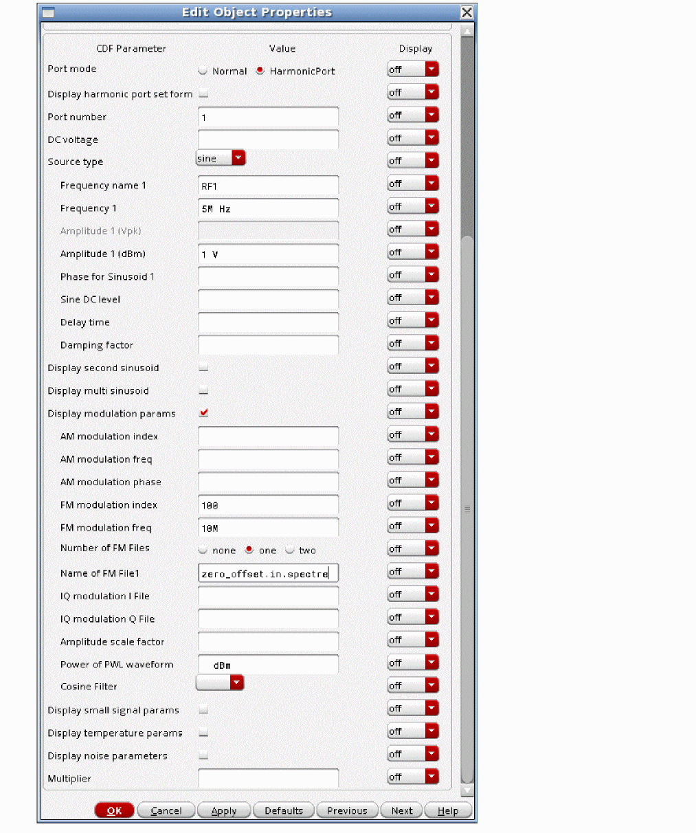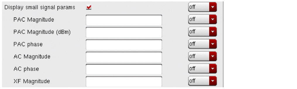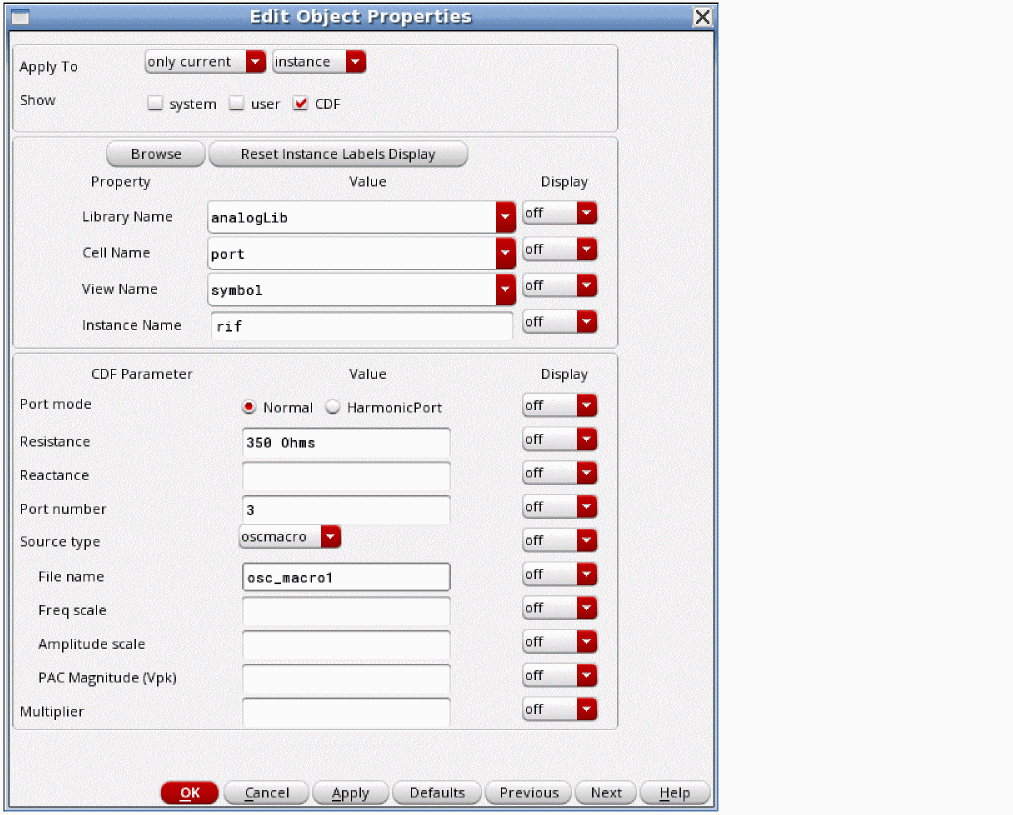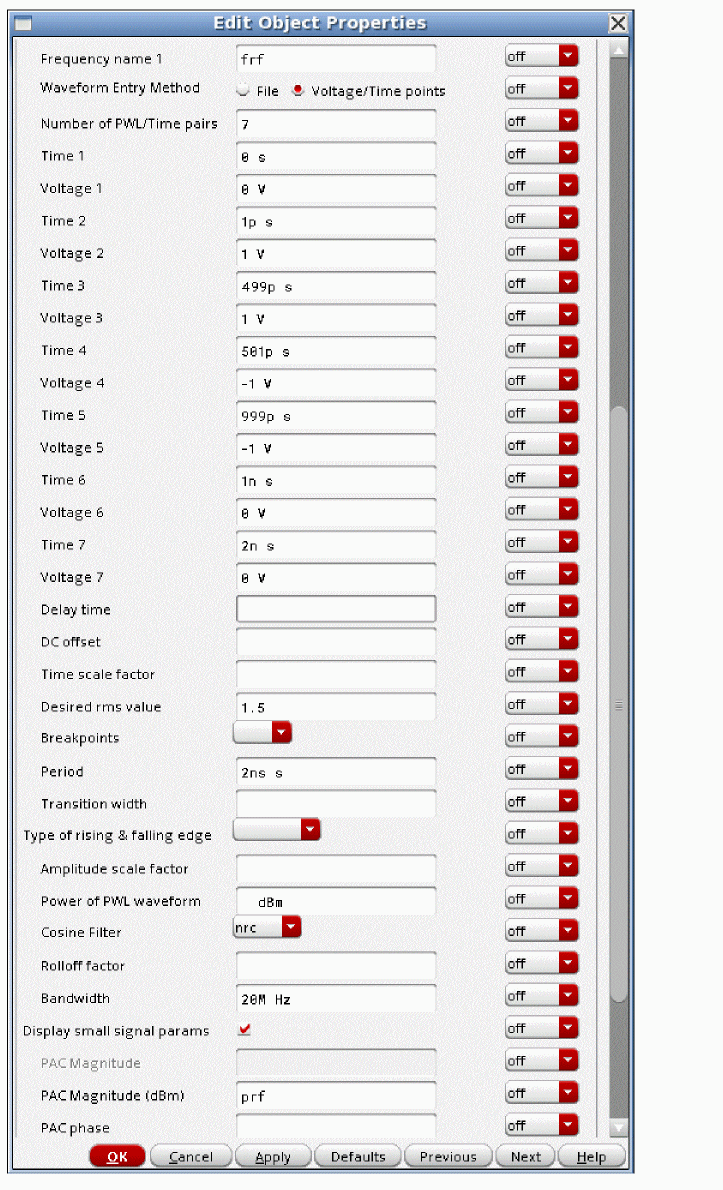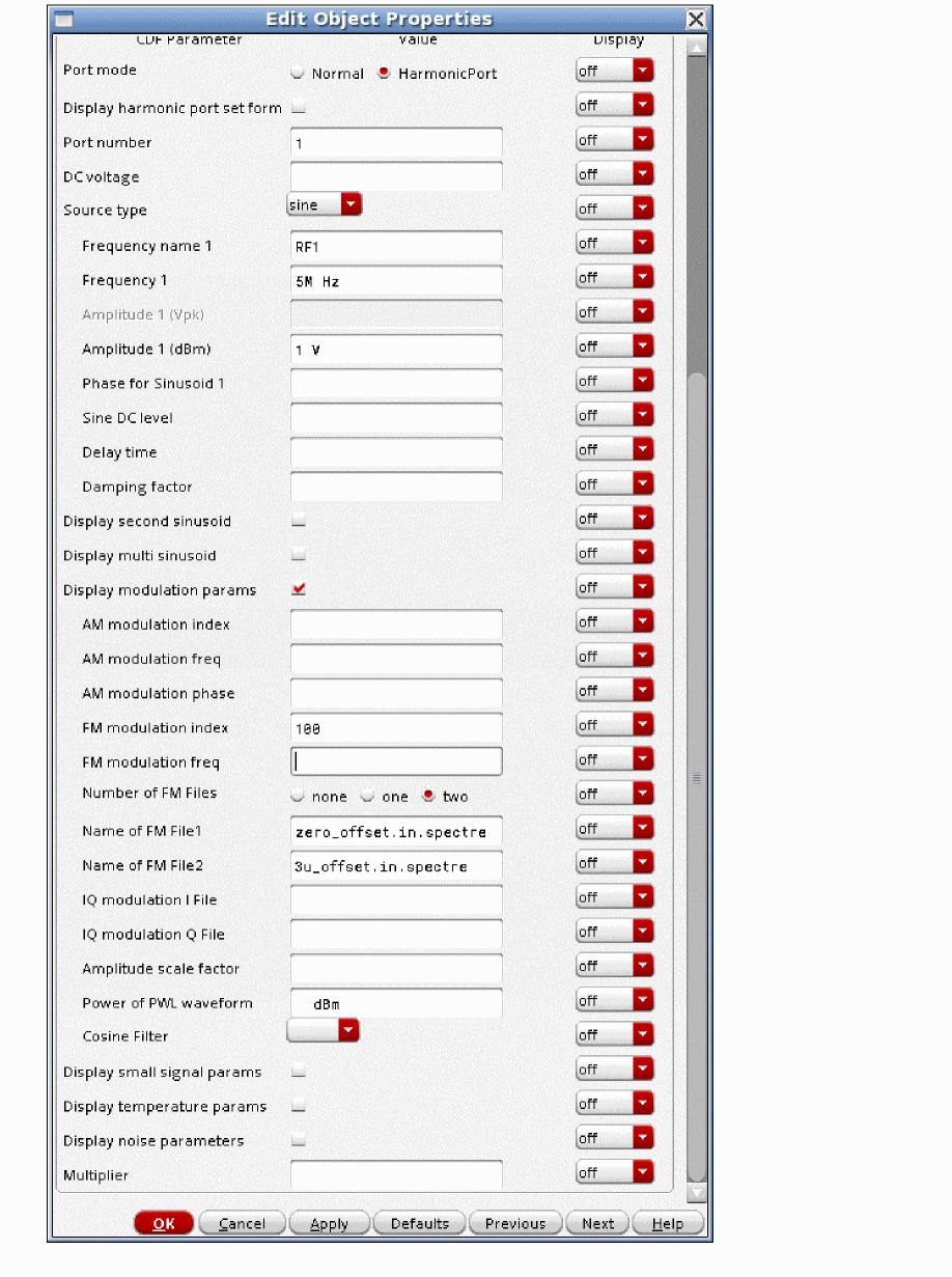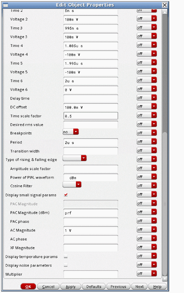 The typical Source types used in SpectreRF analyses are: dc, piecewise linear, pulsed, and sine. For example, you can quickly switch from a sinusoid (for PSS analysis) to a DC level (for PAC analysis) by changing the Source type from sine to dc. The sinusoidal properties remain with the port, and can be changed when the Source type is returned to sine. This is true when switching between any of the sourcetypes. All the properties are retained for everything that you define.