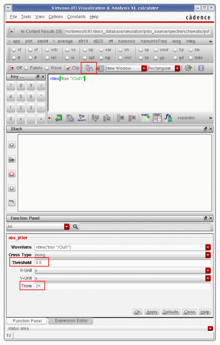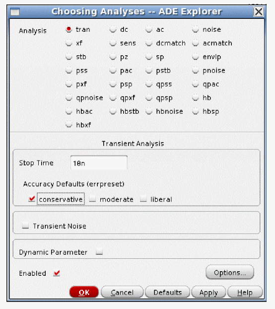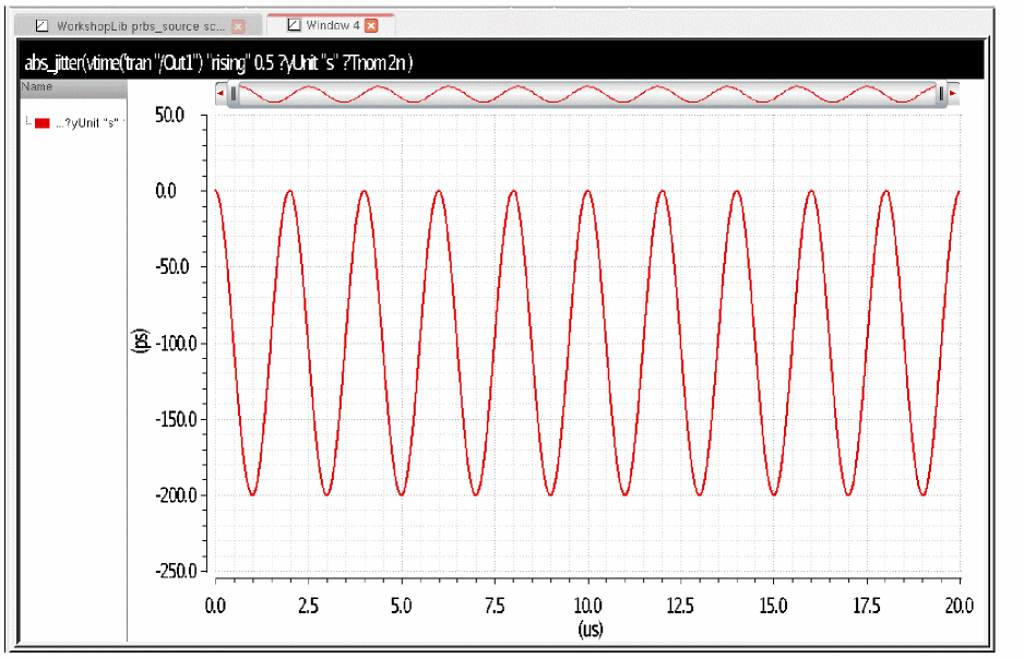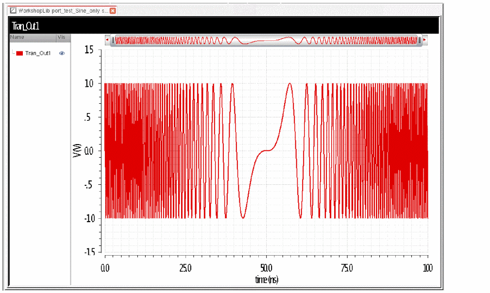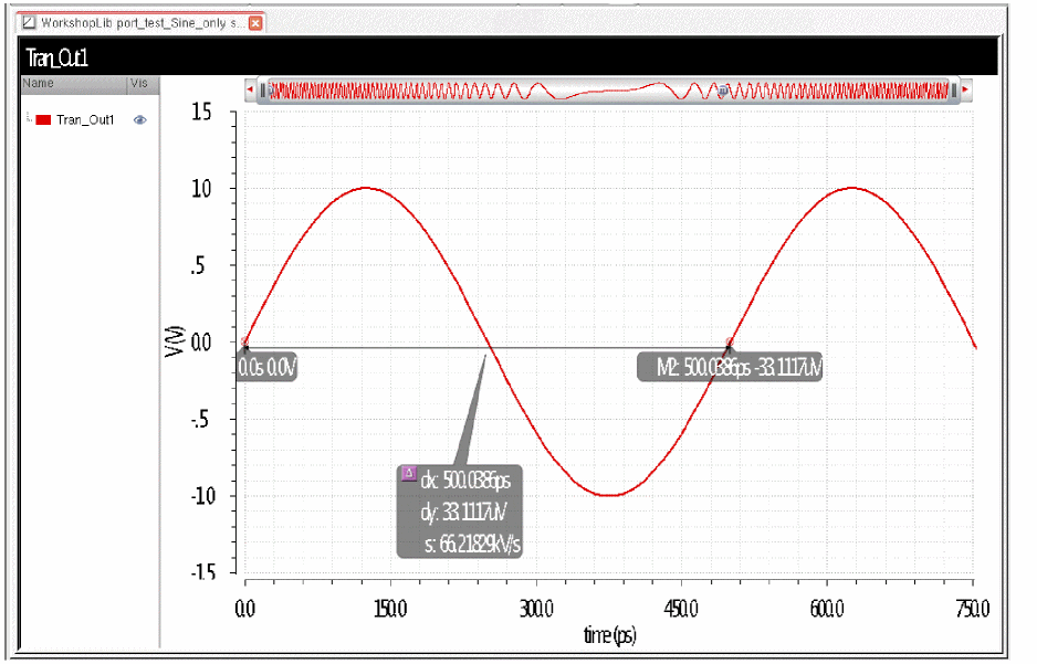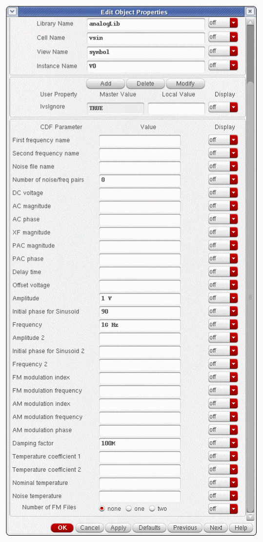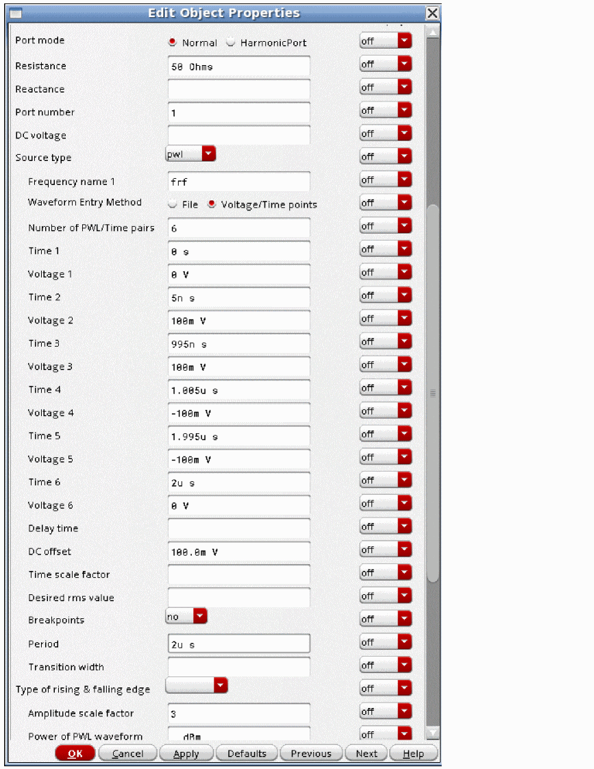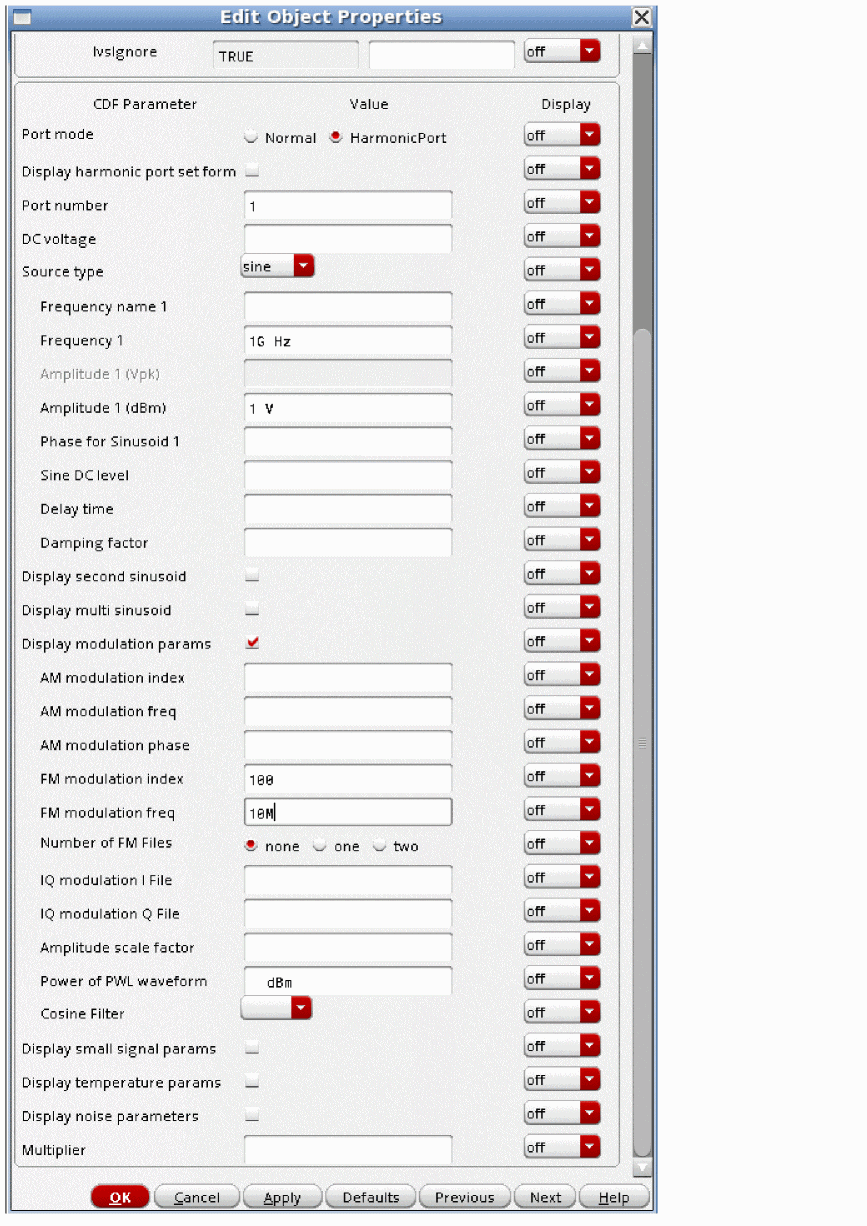 The typical Source types used in SpectreRF analyses are: dc, piecewise linear, pulsed, and sine. For example, you can quickly switch from a sinusoid (for PSS analysis) to a DC level (for PAC analysis) by changing the Source type from sine to dc. The sinusoidal properties remain with the port, and can be changed when the Source type is returned to sine. This is true when switching between any of the sourcetypes. All the properties are retained for everything that you define.