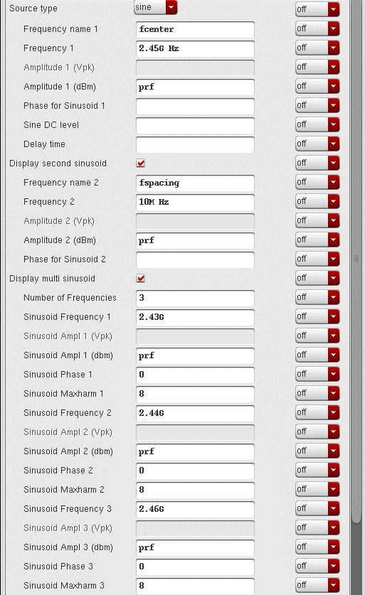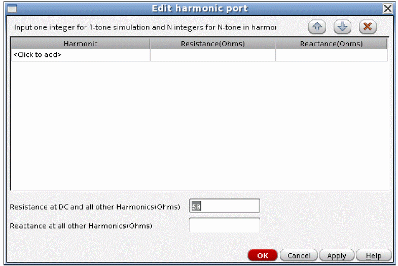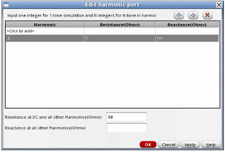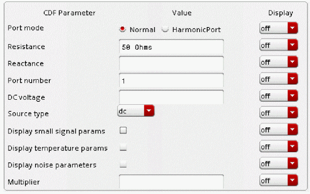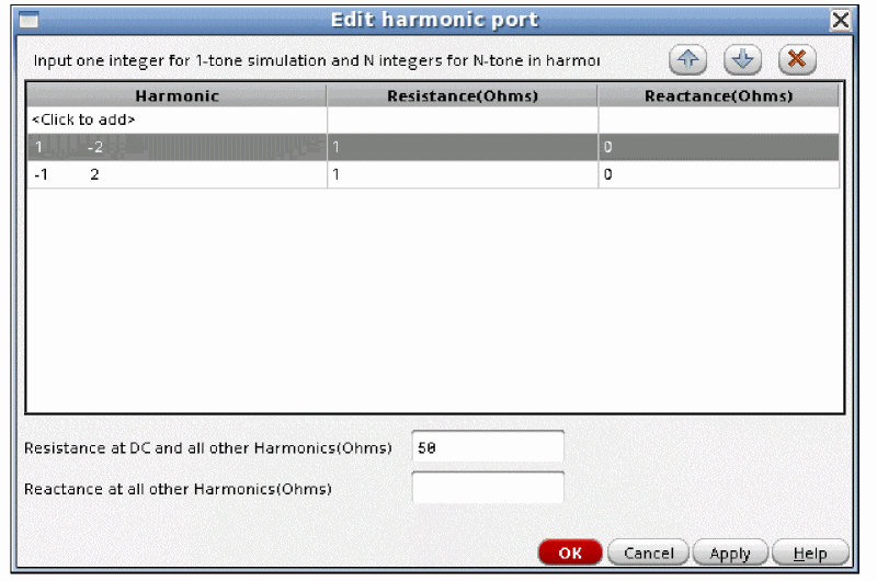 The above example sets the impedance of the third-order intermods to be much lower than 50 ohms. If the source is in series, setting the resistance and/or reactance to a large number can block harmonics you don’t want. If the port is in parallel like this one, setting small resistance and reactance values can short out an undesired harmonic. This can be used for debugging the circuit, or for setting values to maximize power-added efficiency. The resistance or reactance can be left blank, which is interpreted as zero resistance or reactance.