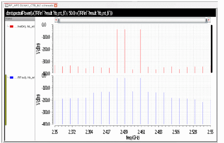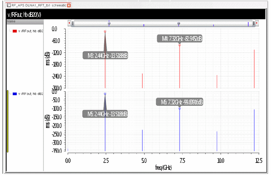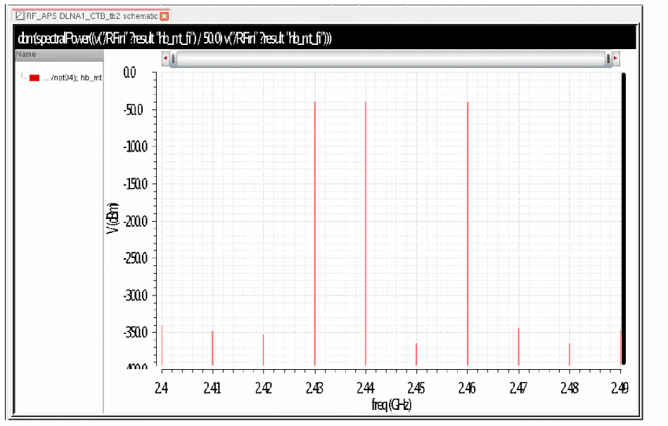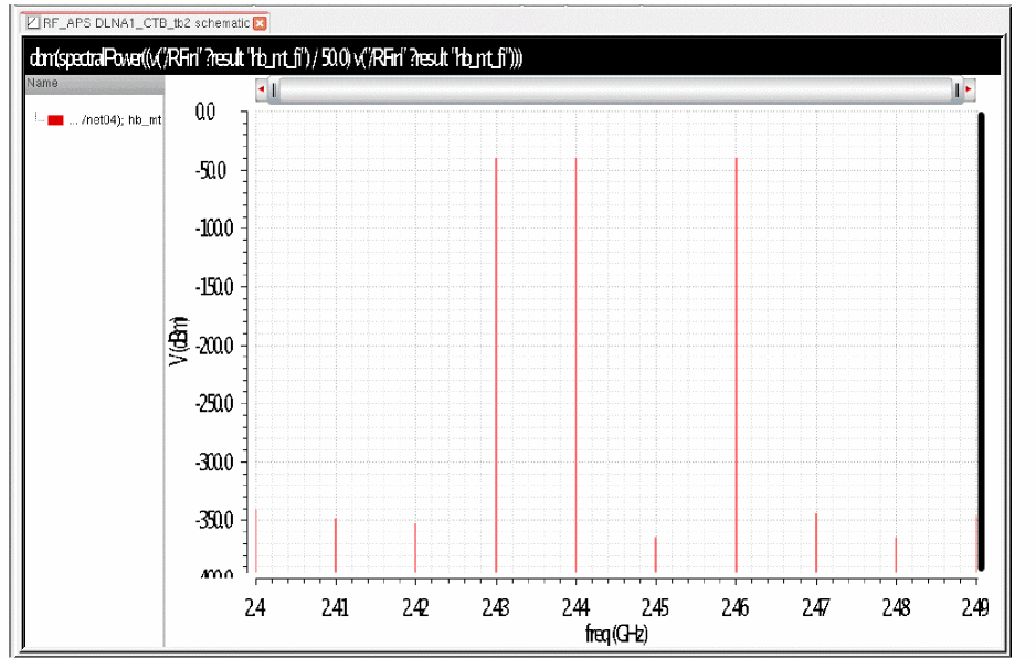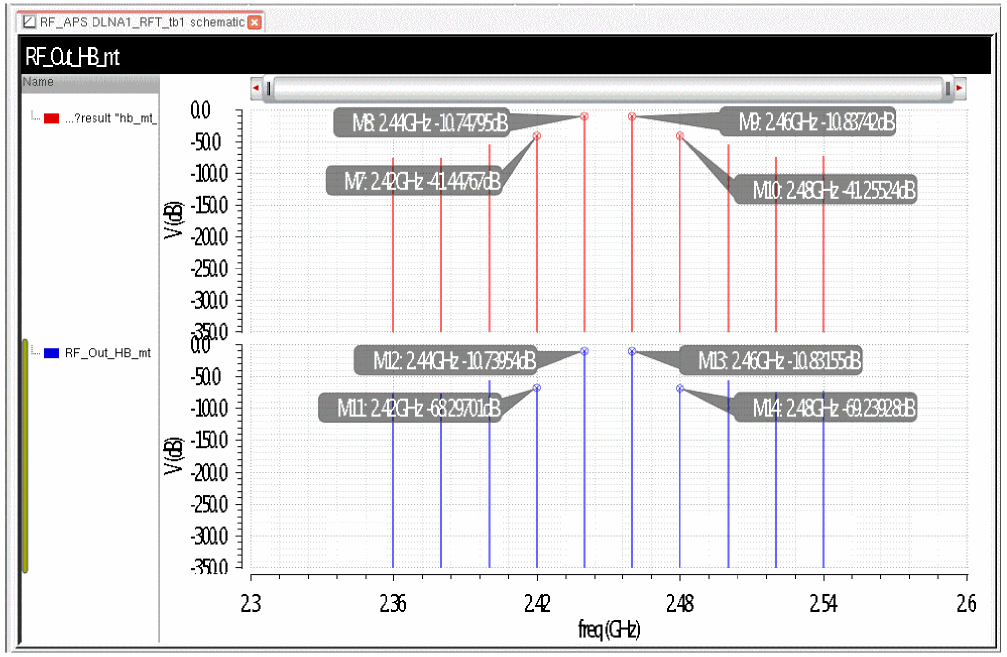 Also, the diamond cut is set with a very large MaximOrder. The reason for doing this is to see the harmonic numbers that correspond to the frequencies produced by the circuit. Each frequency has two harmonic numbers that indicate which harmonics are mixing with which to produce a specific output frequency. For example, take the 2.44GHz term. The harmonic number is 1 0. The frequency that is produced is 1*2.44G + 0*2.46G. Now look at the intermod at 2.42GHz. This index is 2 -1. The frequency is 2*2.44G - 1*2.46G. These are the harmonic numbers that can be set for the harmonic port. Wild cards (*) are not allowed in the harmonic number specification.