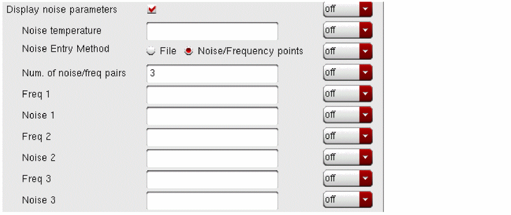 Noise and Gain circles can be plotted at a single dB value for a range of frequencies or at a single frequency for a range of dB values. If you do not enter values for the frequency range, a circle is plotted for every simulated frequency for which a circle with the specified value exists.