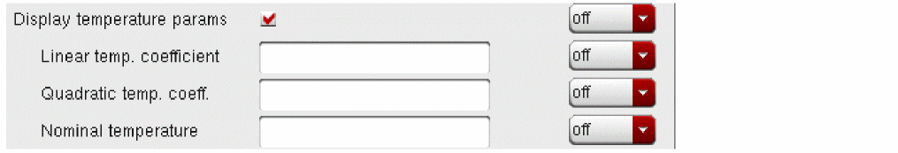 The Display small signal params, Display temperature params, and Display noise parameters fields are discussed in Small-Signal Parameters, “Temperature Effect Parameters”, and “PRBS Waveform Parameters”.