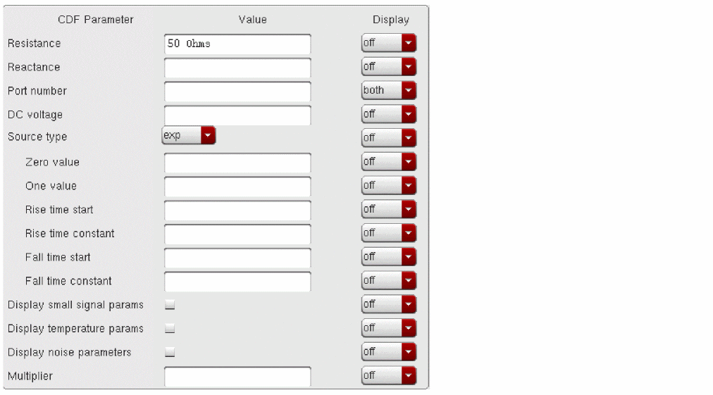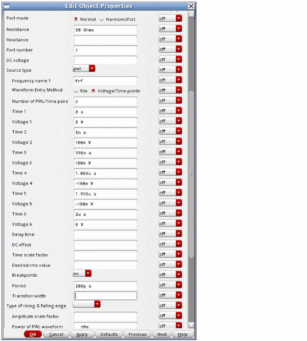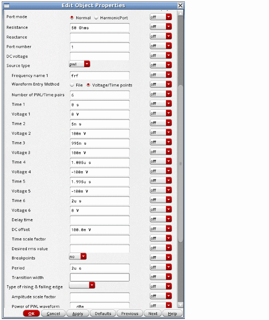 The Source type parameter lets you select a wave shape for the port from the Source type cyclic field: dc, pulse, exp, pwl, pwlz, sine, bit, prbs, oscmacro, or blank. Each Source type has different parameter settings associated with it. You can define several different wave shapes and quickly switch between them without losing the wave shape settings. The wave shape settings are described in detail in the following sections: