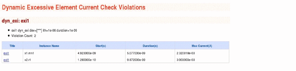 The above command will report all device instances that carry excessive currents higher than 1e-06 for a duration longer than 1e-09s. The following is an example of the report that is displayed in the Web browser: