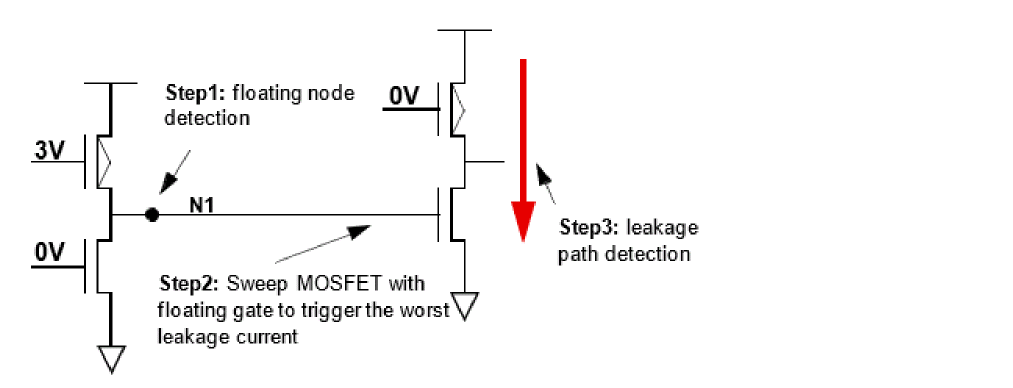 Worst leakage paths caused by floating gate MOSFET devices are estimated and reported. The leakage paths are checked between the specified power supply nodes (net).